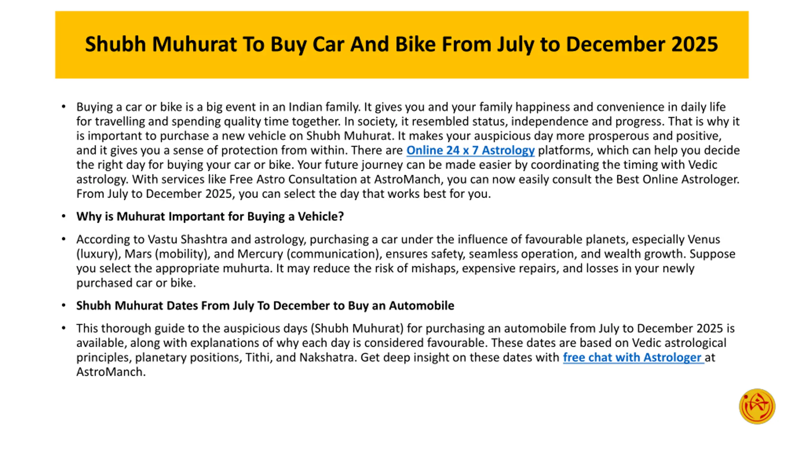 Shubh Muhurat To Buy Car And Bike From July to December 2025 Buying a car or bike is a big event in an Indian family. It gives you and your family happiness and convenience in daily life for travelling and spending quality time together. In society, it resembled status, independence and progress. That is why it is important to purchase a new vehicle on Shubh Muhurat. It makes your auspicious day more prosperous and positive, and it gives you a sense of protection from within. There are Online 24 x 7 Astrology platforms, which can help you decide the right day for buying your car or bike. Your future journey can be made easier by coordinating the timing with Vedic astrology. With services like Free Astro Consultation at AstroManch, you can now easily consult the Best Online Astrologer. From July to December 2025, you can select the day that works best for you. Why is Muhurat Important for Buying a Vehicle? According to Vastu Shashtra and astrology, purchasing a car under the influence of favourable planets, especially Venus (luxury), Mars (mobility), and Mercury (communication), ensures safety, seamless operation, and wealth growth. Suppose you select the appropriate muhurta. It may reduce the risk of mishaps, expensive repairs, and losses in your newly purchased car or bike. Shubh Muhurat Dates From July To December to Buy an Automobile This thorough guide to the auspicious days (Shubh Muhurat) for purchasing an automobile from July to December 2025 is available, along with explanations of why each day is considered favourable. These dates are based on Vedic astrological principles, planetary positions, Tithi, and Nakshatra. Get deep insight on these dates with free chat with Astrologer at AstroManch.
