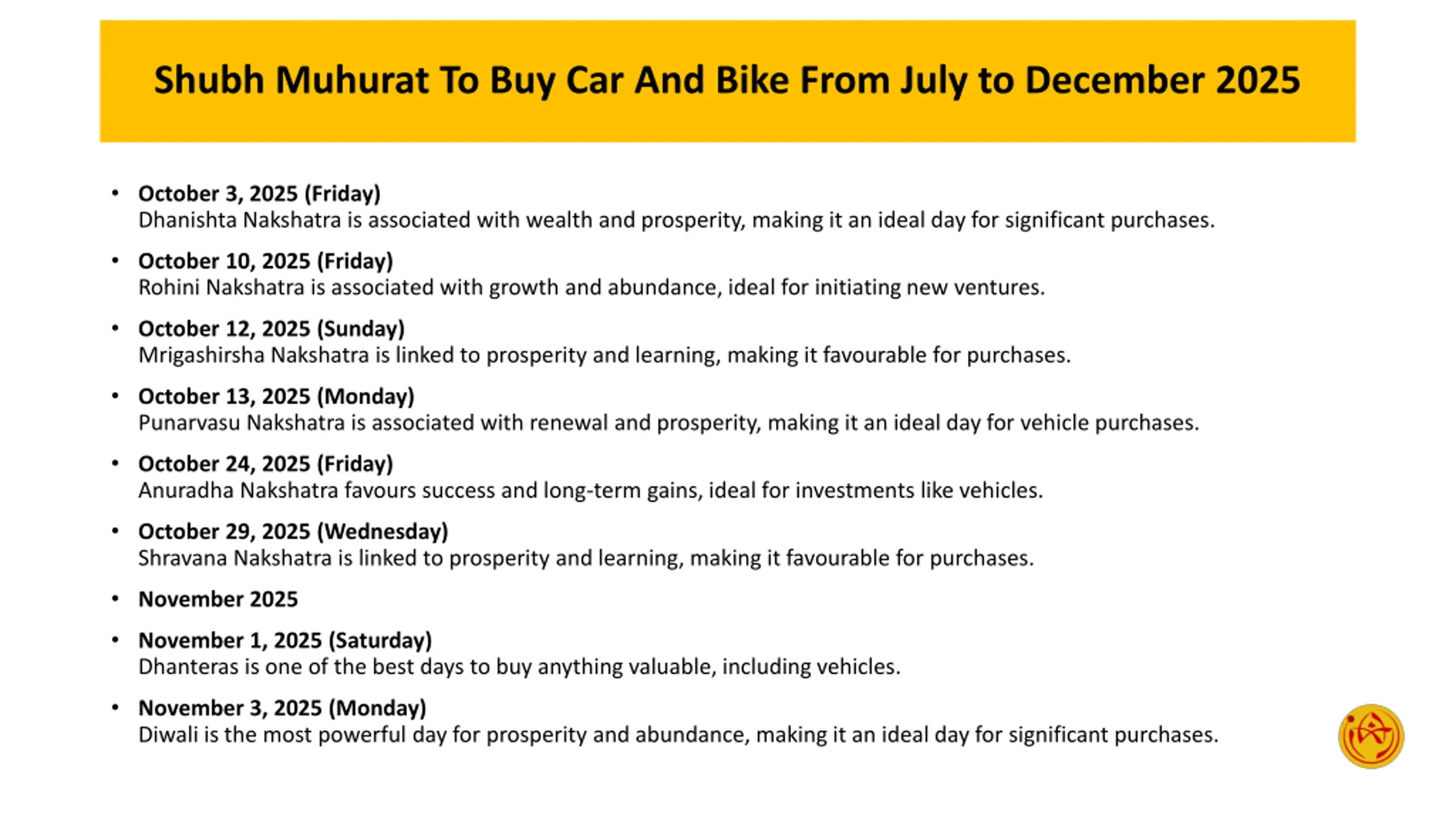 Shubh Muhurat To Buy Car And Bike From July to December 2025 October 3, 2025 (Friday) Dhanishta Nakshatra is associated with wealth and prosperity, making it an ideal day for significant purchases. October 10, 2025 (Friday) Rohini Nakshatra is associated with growth and abundance, ideal for initiating new ventures. October 12, 2025 (Sunday) Mrigashirsha Nakshatra is linked to prosperity and learning, making it favourable for purchases. October 13, 2025 (Monday) Punarvasu Nakshatra is associated with renewal and prosperity, making it an ideal day for vehicle purchases. October 24, 2025 (Friday) Anuradha Nakshatra favours success and long-term gains, ideal for investments like vehicles. October 29, 2025 (Wednesday) Shravana Nakshatra is linked to prosperity and learning, making it favourable for purchases. November 2025 November 1, 2025 (Saturday) Dhanteras is one of the best days to buy anything valuable, including vehicles. November 3, 2025 (Monday) Diwali is the most powerful day for prosperity and abundance, making it an ideal day for significant purchases.