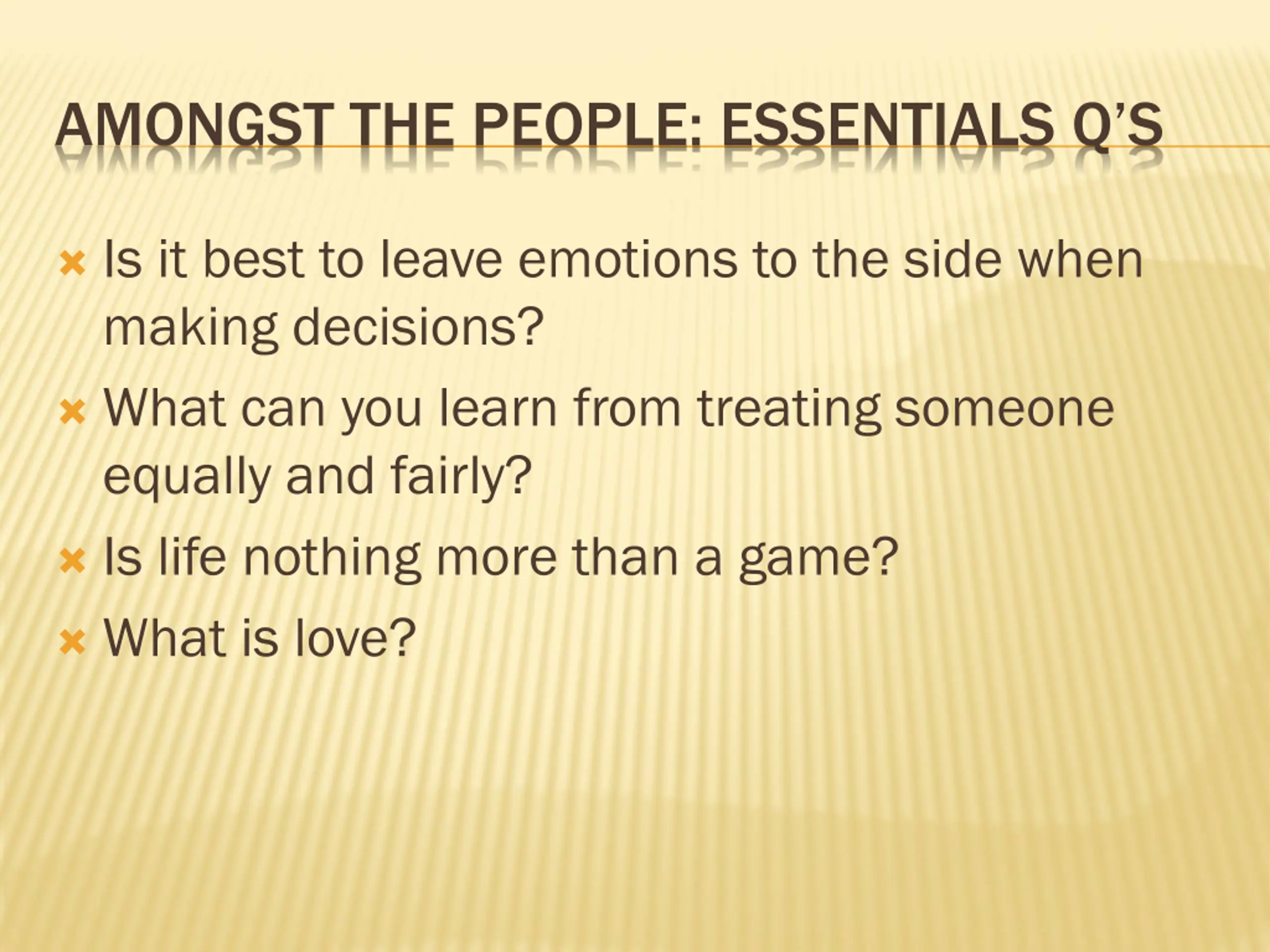 AMONGST THE PEOPLE: ESSENTIALS QS Is it best to leave emotions to the side when making decisions? What can you learn from treating someone equally and fairly? Is life nothing more than a game? What is love?