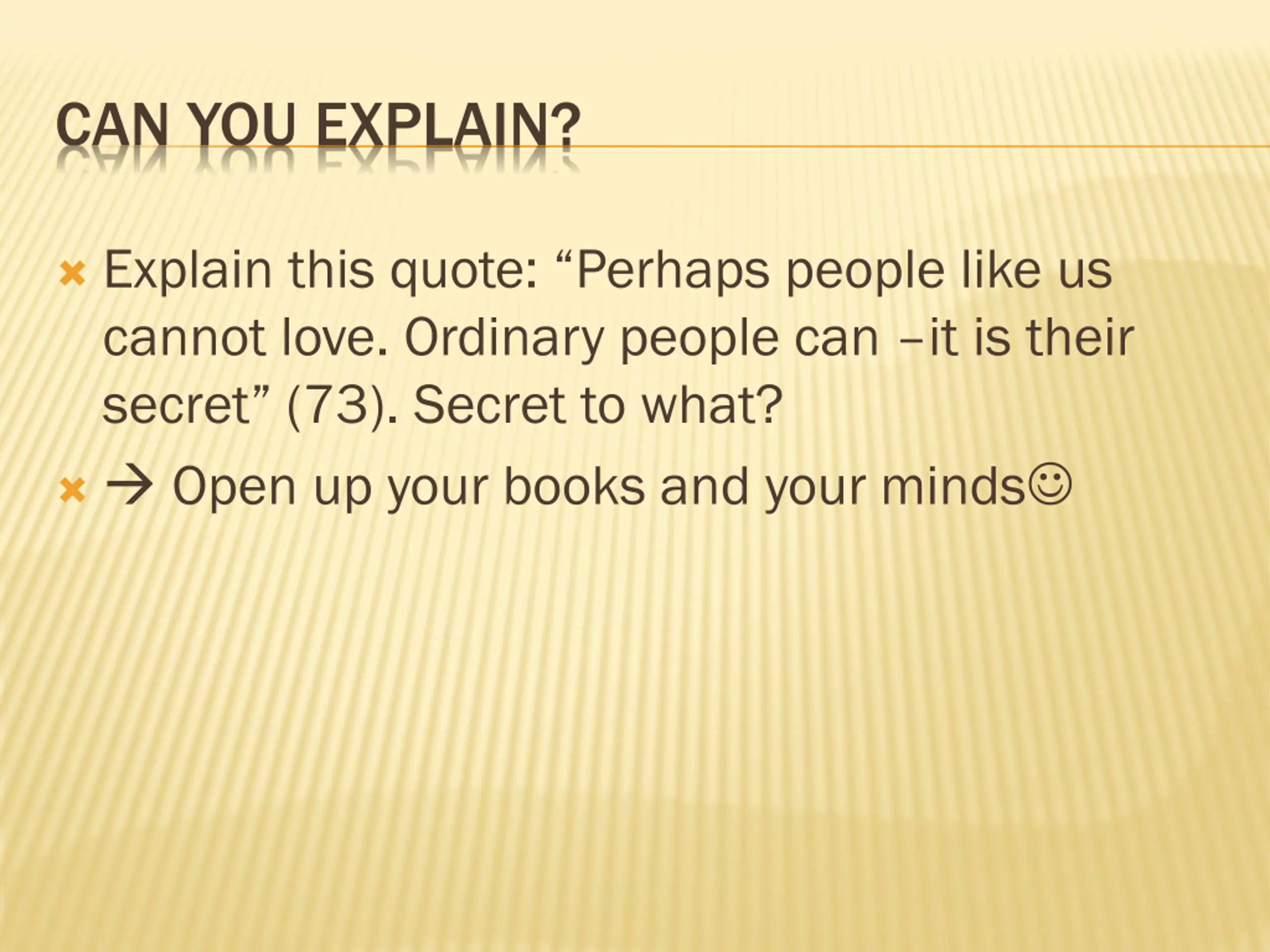 CAN YOU EXPLAIN? Explain this quote: Perhaps people like us cannot love. Ordinary people can it is their secret (73). Secret to what? Open up your books and your minds