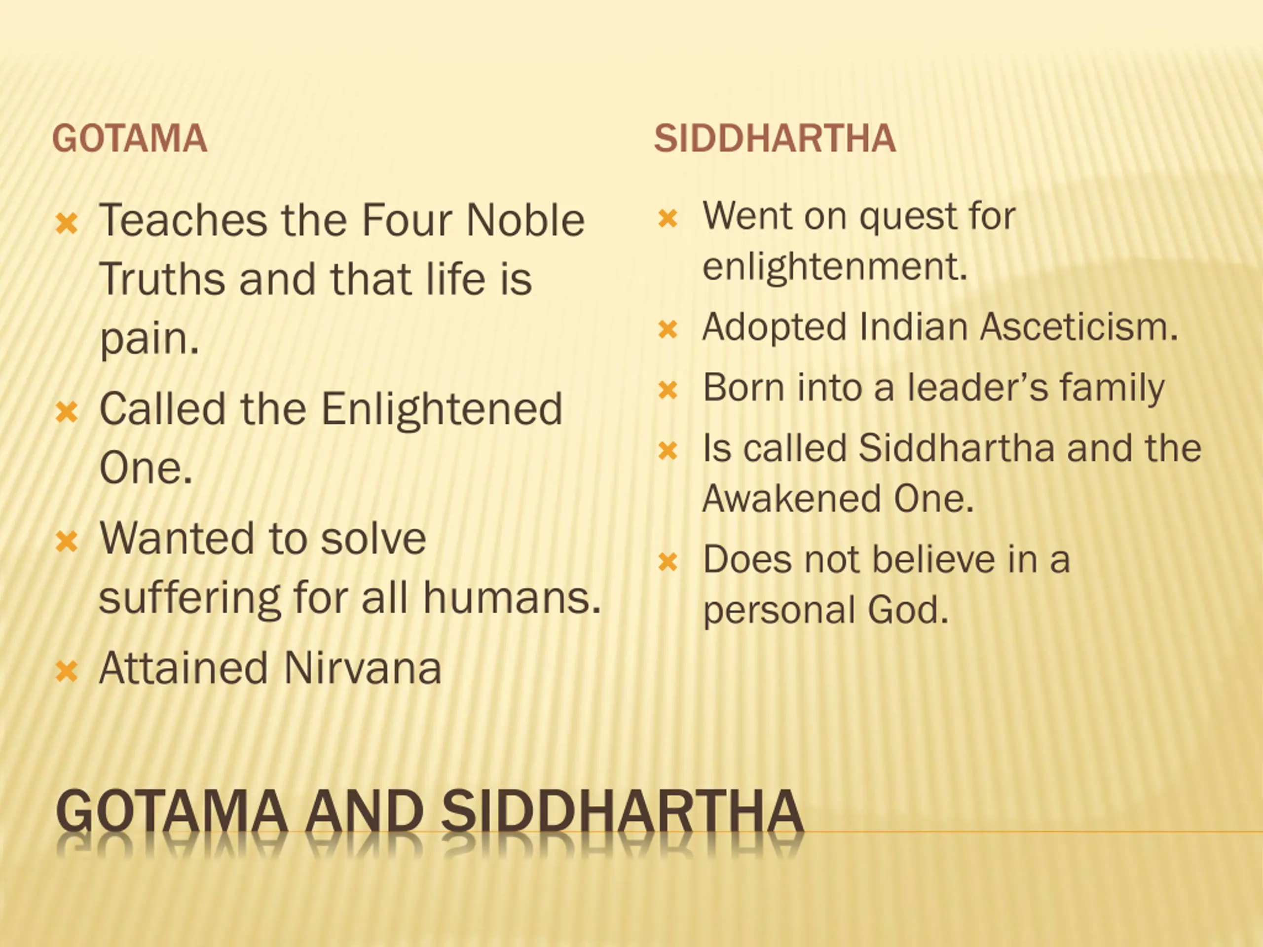 GOTAMA SIDDHARTHA Went on quest for enlightenment. Adopted Indian Asceticism. Born into a leader s family Is called Siddhartha and the Awakened One. Does not believe in a personal God. Teaches the Four Noble Truths and that life is pain. Called the Enlightened One. Wanted to solve suffering for all humans. Attained Nirvana GOTAMA AND SIDDHARTHA
