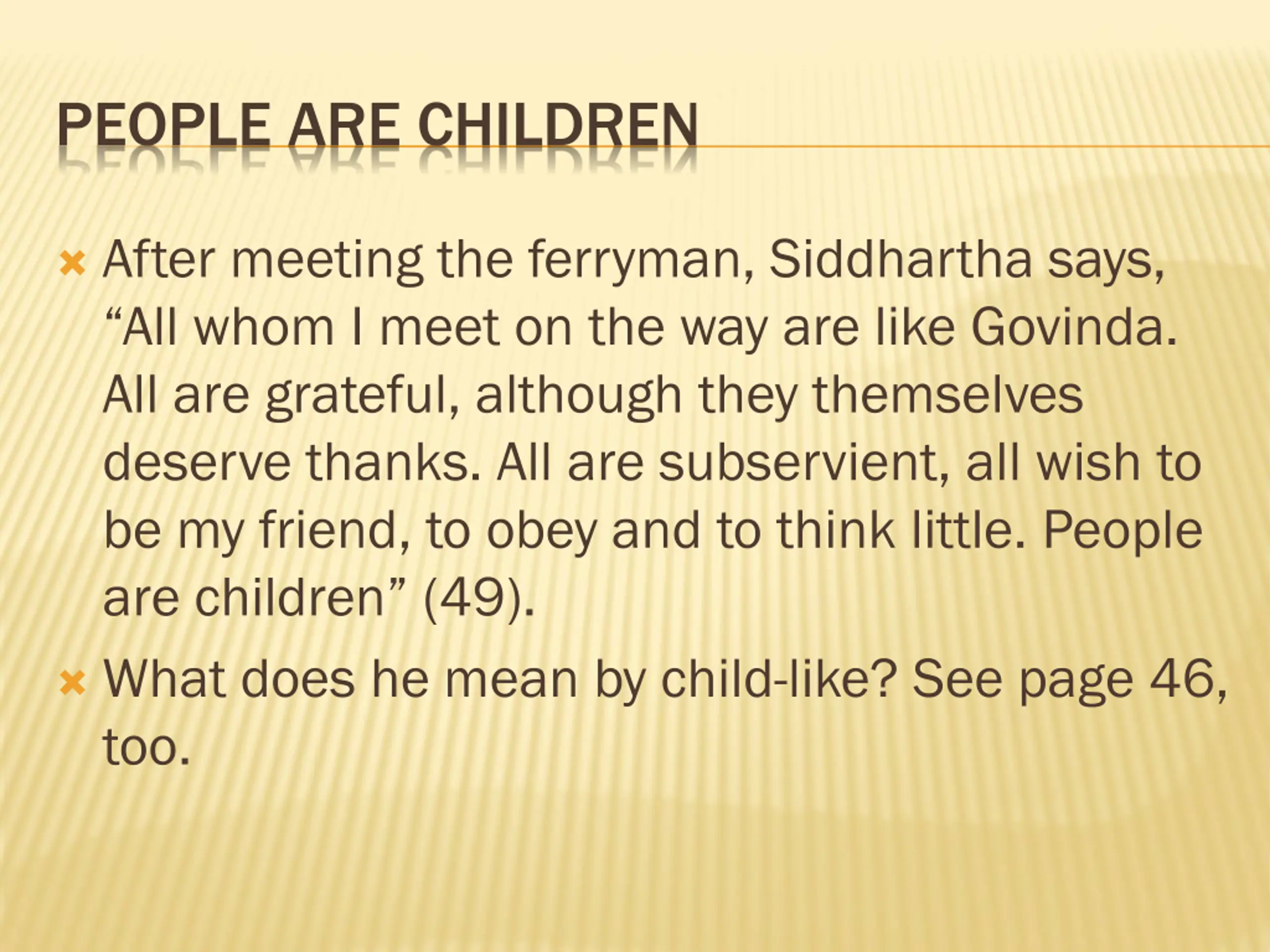 PEOPLE ARE CHILDREN After meeting the ferryman, Siddhartha says, All whom I meet on the way are like Govinda. All are grateful, although they themselves deserve thanks. All are subservient, all wish to be my friend, to obey and to think little. People are children (49). What does he mean by child-like? See page 46, too.