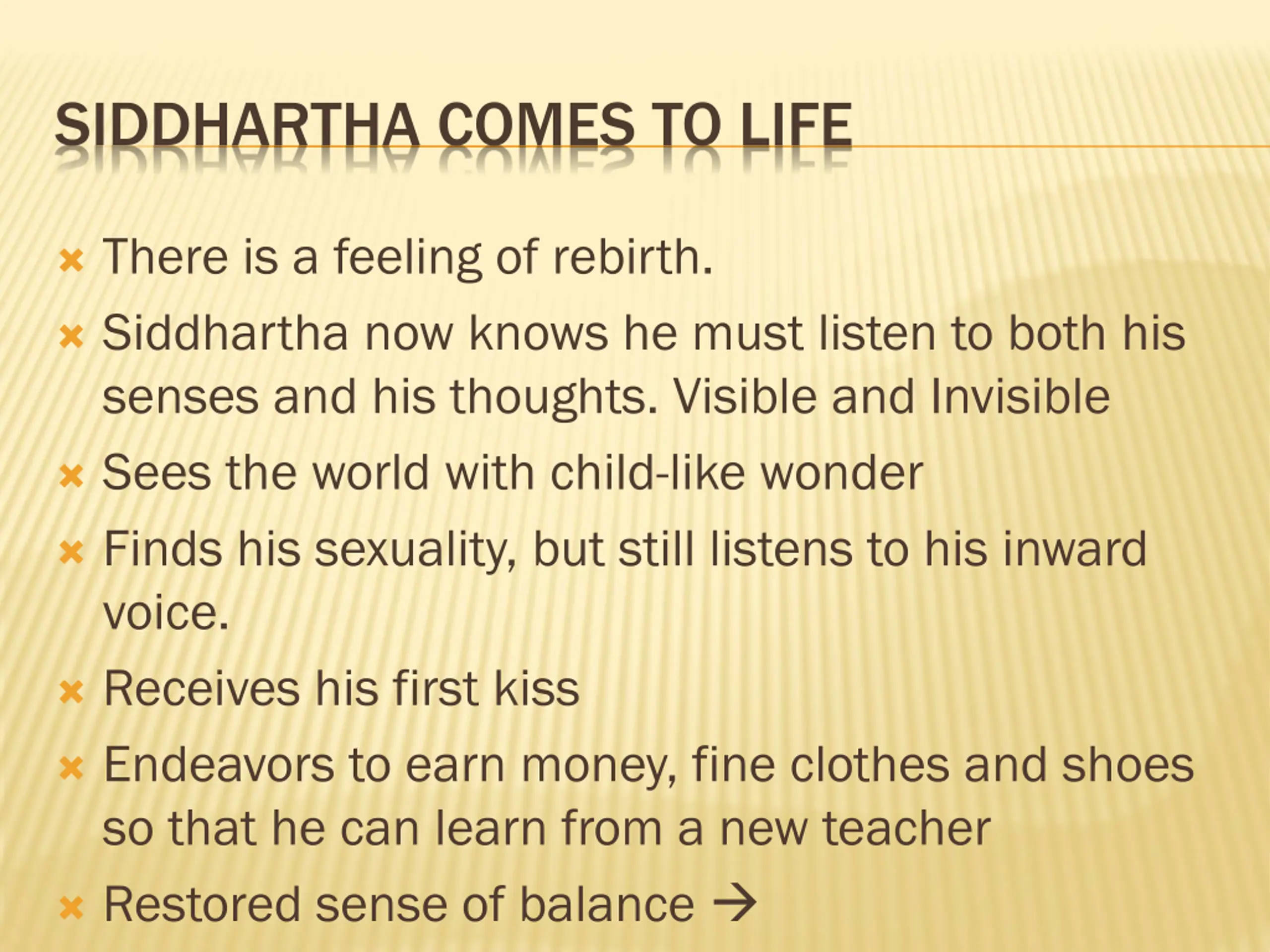 SIDDHARTHA COMES TO LIFE There is a feeling of rebirth. Siddhartha now knows he must listen to both his senses and his thoughts. Visible and Invisible Sees the world with child-like wonder Finds his sexuality, but still listens to his inward voice. Receives his first kiss Endeavors to earn money, fine clothes and shoes so that he can learn from a new teacher Restored sense of balance