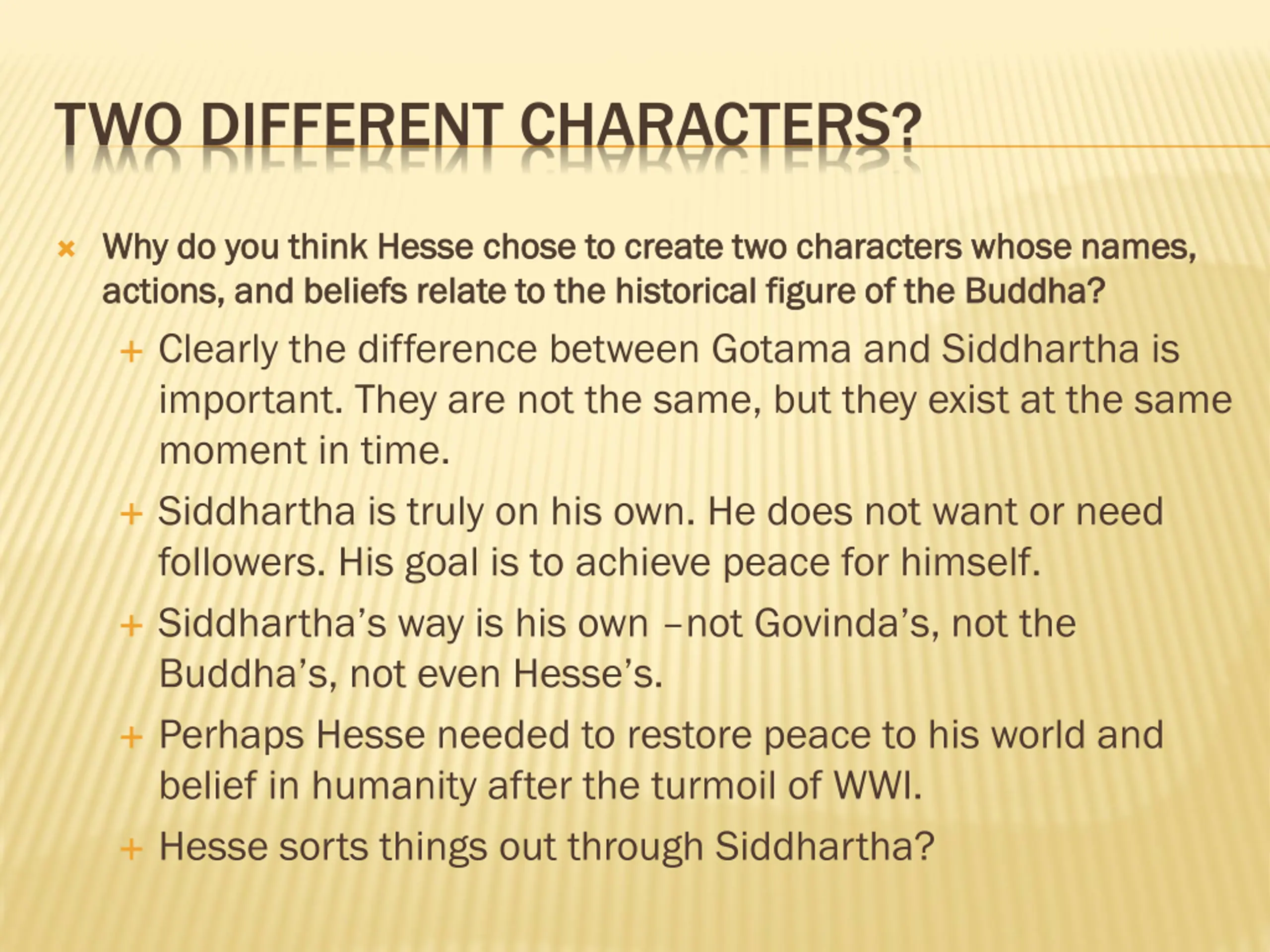 TWO DIFFERENT CHARACTERS? Why do you think Why do you think Hesse actions, and beliefs relate to the historical figure of the Buddha? actions, and beliefs relate to the historical figure of the Buddha? Clearly the difference between Gotama and Siddhartha is important. They are not the same, but they exist at the same moment in time. Siddhartha is truly on his own. He does not want or need followers. His goal is to achieve peace for himself. Siddhartha s way is his own not Govinda s, not the Buddha s, not even Hesse s. Perhaps Hesse needed to restore peace to his world and belief in humanity after the turmoil of WWI. Hesse sorts things out through Siddhartha? Hesse chose to create two characters whose names, chose to create two characters whose names,