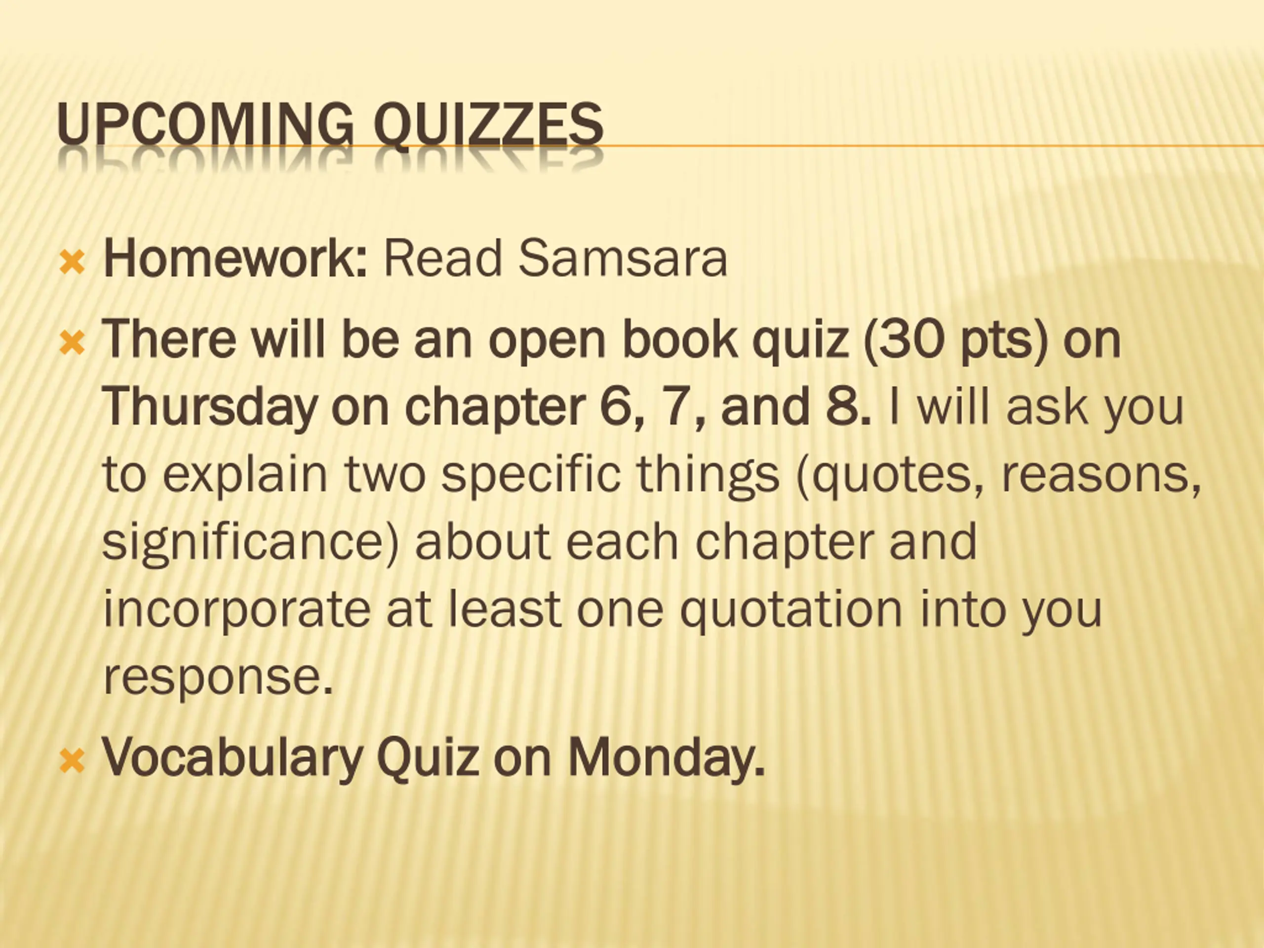 UPCOMING QUIZZES Homework: Homework: Read Samsara There will be an open book quiz (30 pts) on There will be an open book quiz (30 pts) on Thursday on chapter 6, 7, and 8. Thursday on chapter 6, 7, and 8. I will ask you to explain two specific things (quotes, reasons, significance) about each chapter and incorporate at least one quotation into you response. Vocabulary Quiz on Monday. Vocabulary Quiz on Monday.