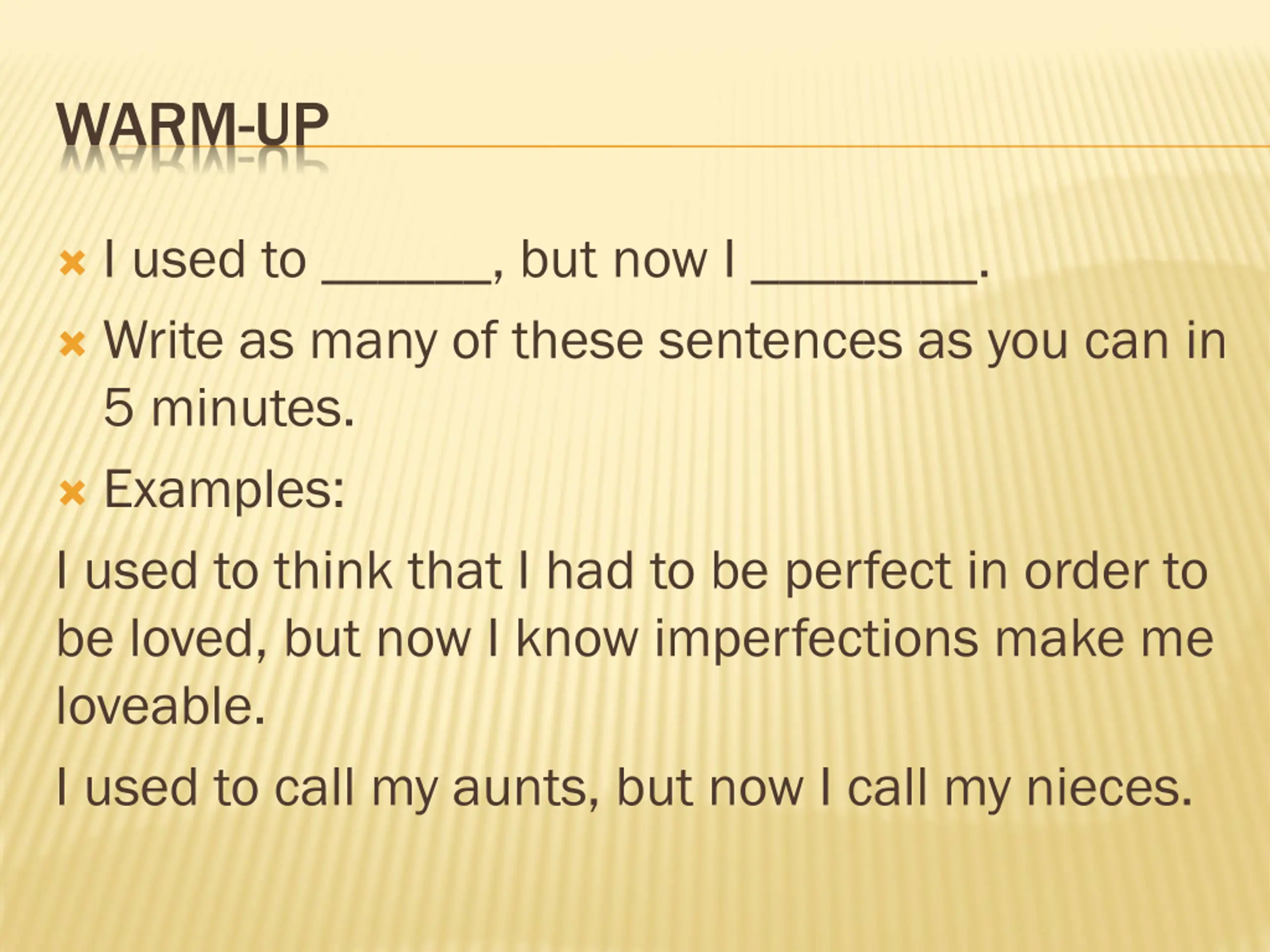 WARM-UP I used to ______, but now I ________. Write as many of these sentences as you can in 5 minutes. Examples: I used to think that I had to be perfect in order to be loved, but now I know imperfections make me loveable. I used to call my aunts, but now I call my nieces.