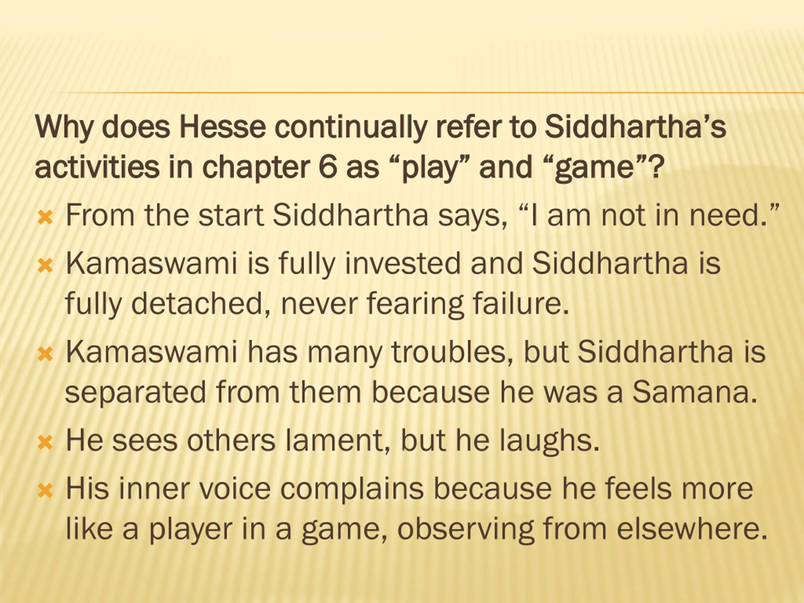 Why does Why does Hesse activities in chapter 6 as play and game activities in chapter 6 as play and game ? From the start Siddhartha says, I am not in need. Kamaswami is fully invested and Siddhartha is fully detached, never fearing failure. Kamaswami has many troubles, but Siddhartha is separated from them because he was a Samana. He sees others lament, but he laughs. His inner voice complains because he feels more like a player in a game, observing from elsewhere. Hesse continually refer to Siddhartha s continually refer to Siddhartha s ?