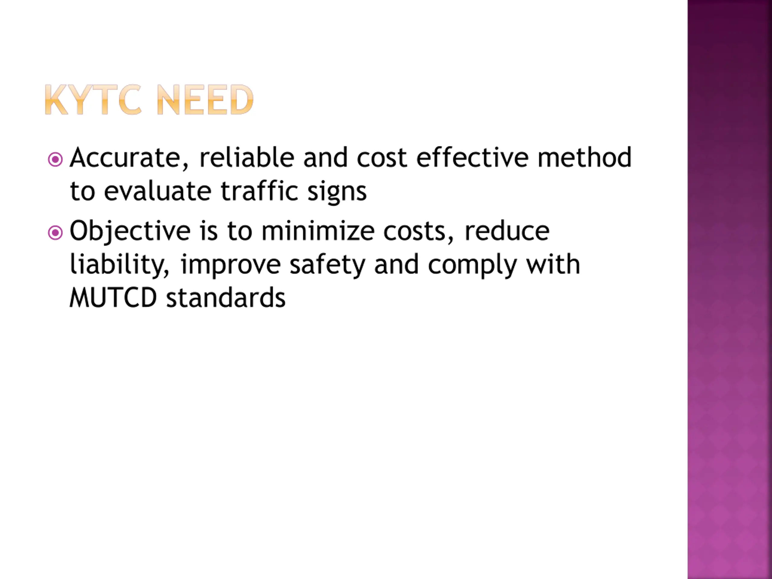 KYTC NEED Accurate, reliable and cost effective method to evaluate traffic signs Objective is to minimize costs, reduce liability, improve safety and comply with MUTCD standards