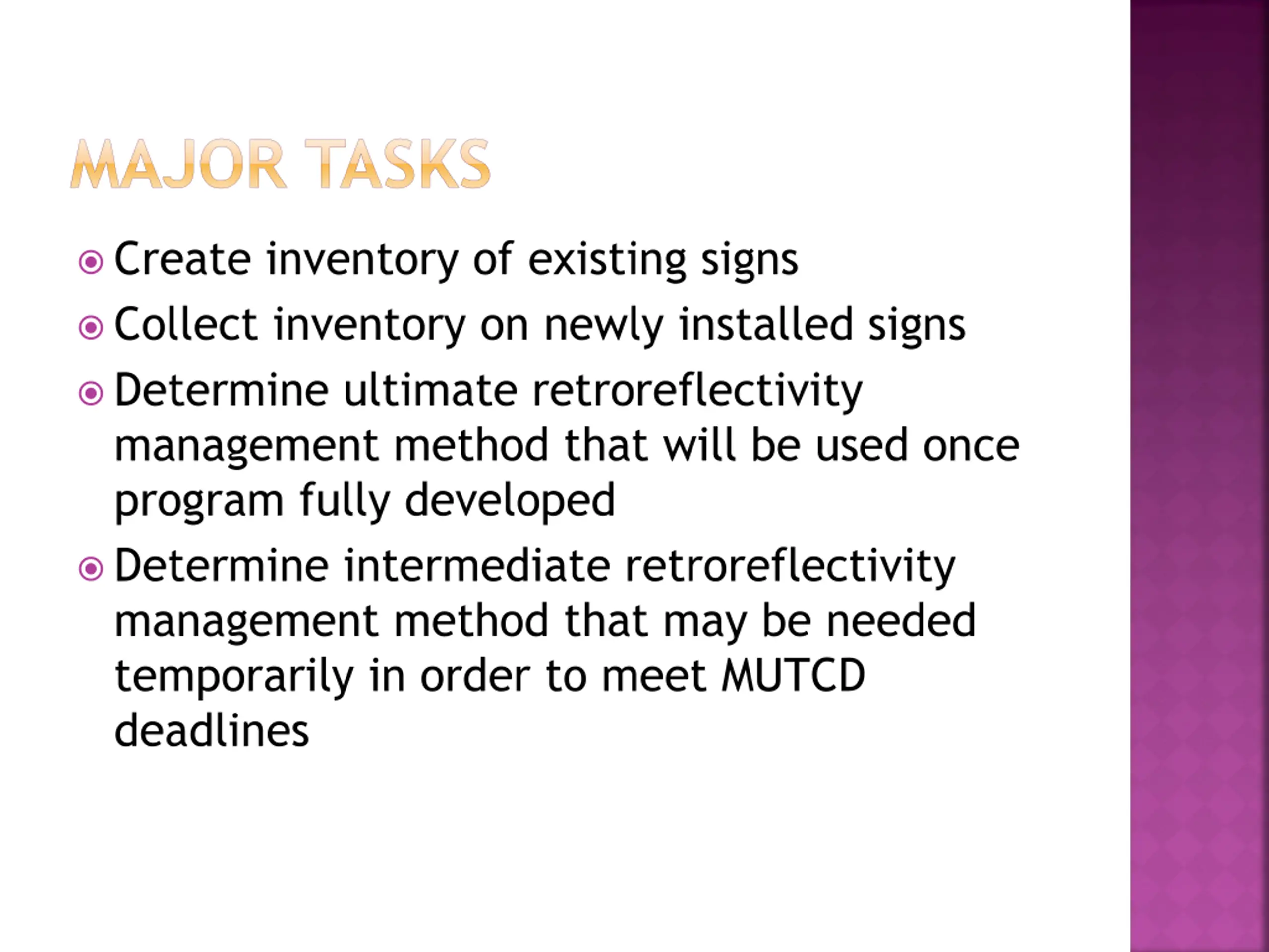 MAJOR TASKS Create inventory of existing signs Collect inventory on newly installed signs Determine ultimate retroreflectivity management method that will be used once program fully developed Determine intermediate retroreflectivity management method that may be needed temporarily in order to meet MUTCD deadlines