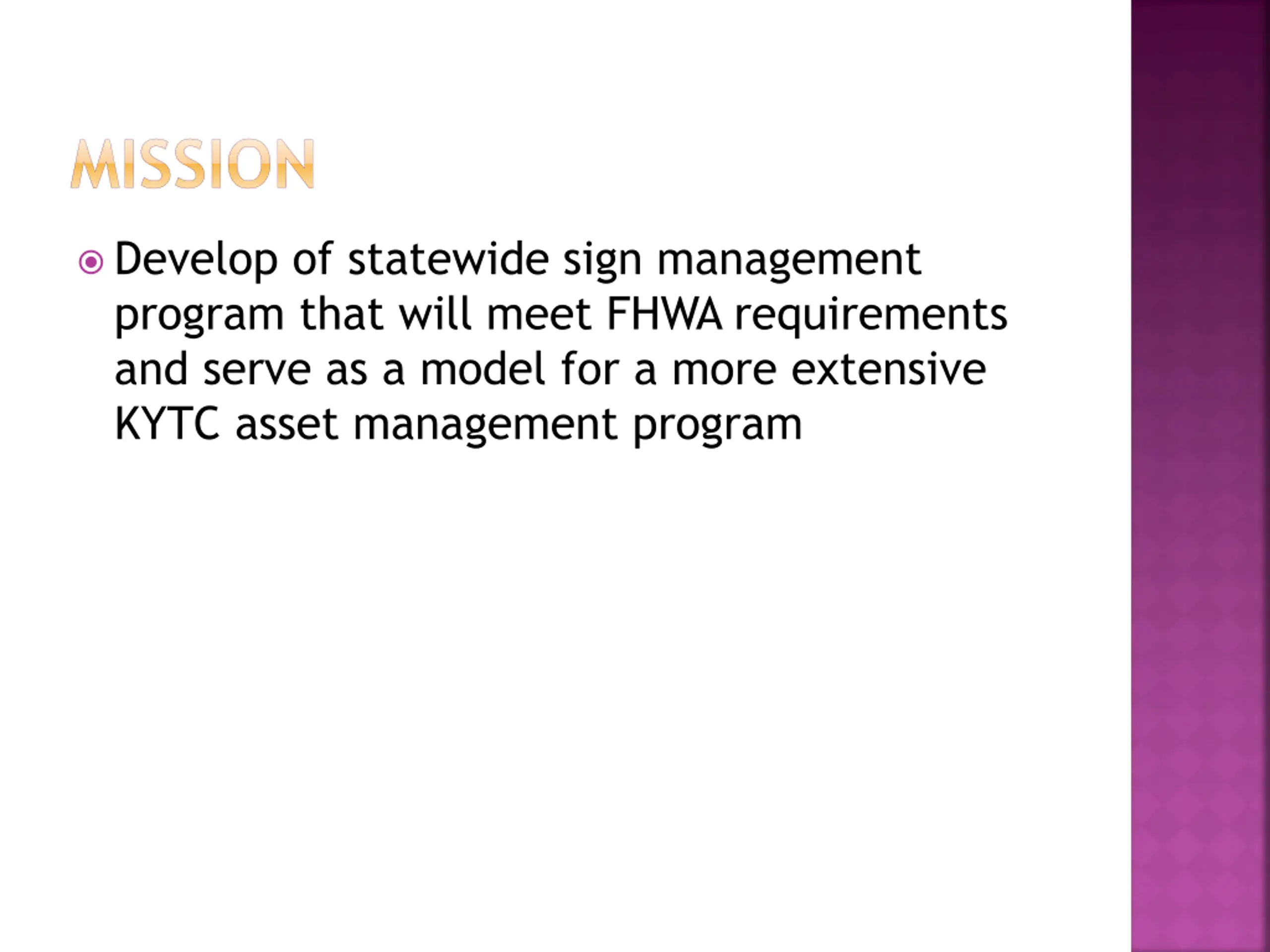 MISSION Develop of statewide sign management program that will meet FHWA requirements and serve as a model for a more extensive KYTC asset management program