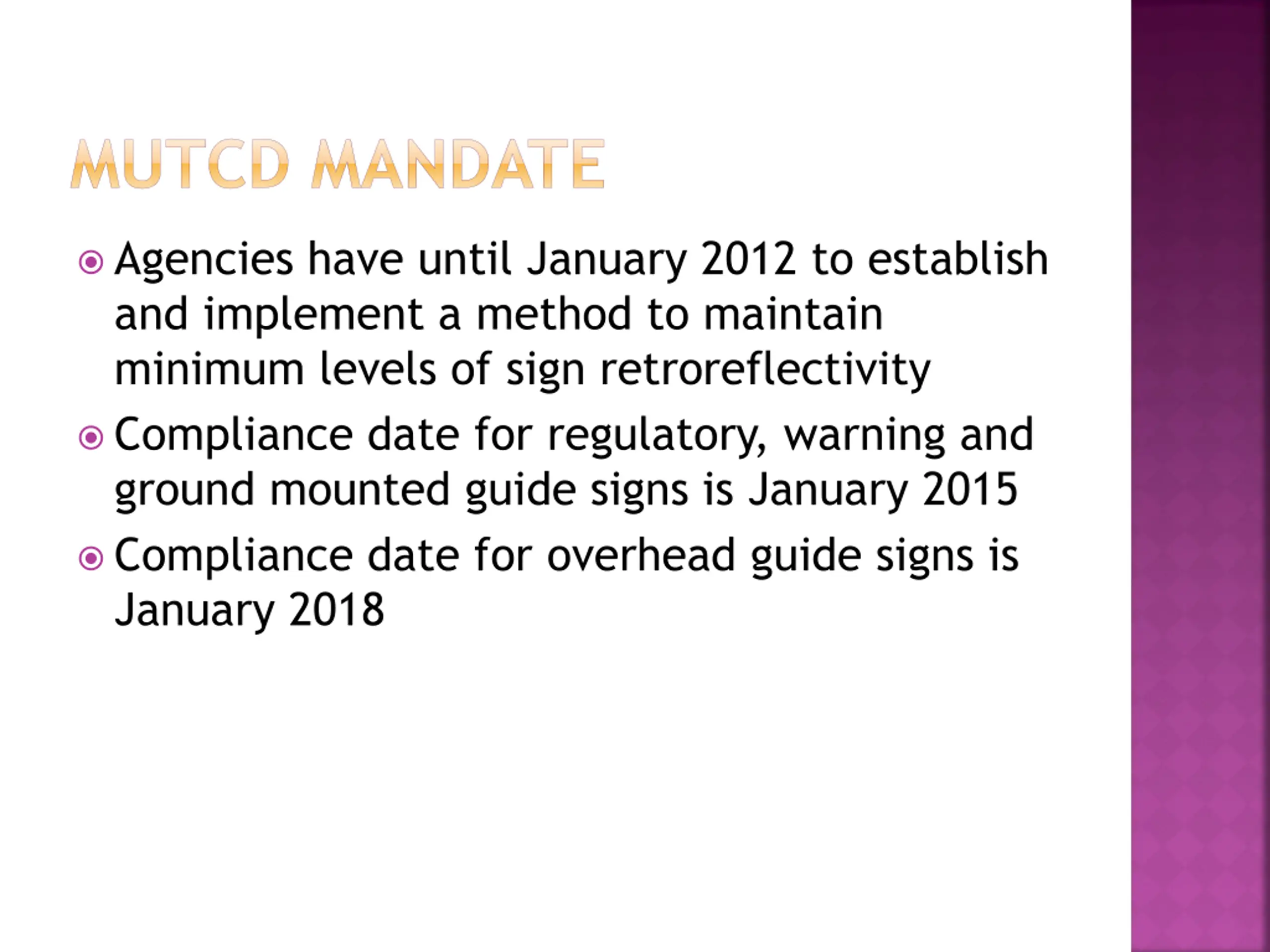 MUTCD MANDATE Agencies have until January 2012 to establish and implement a method to maintain minimum levels of sign retroreflectivity Compliance date for regulatory, warning and ground mounted guide signs is January 2015 Compliance date for overhead guide signs is January 2018