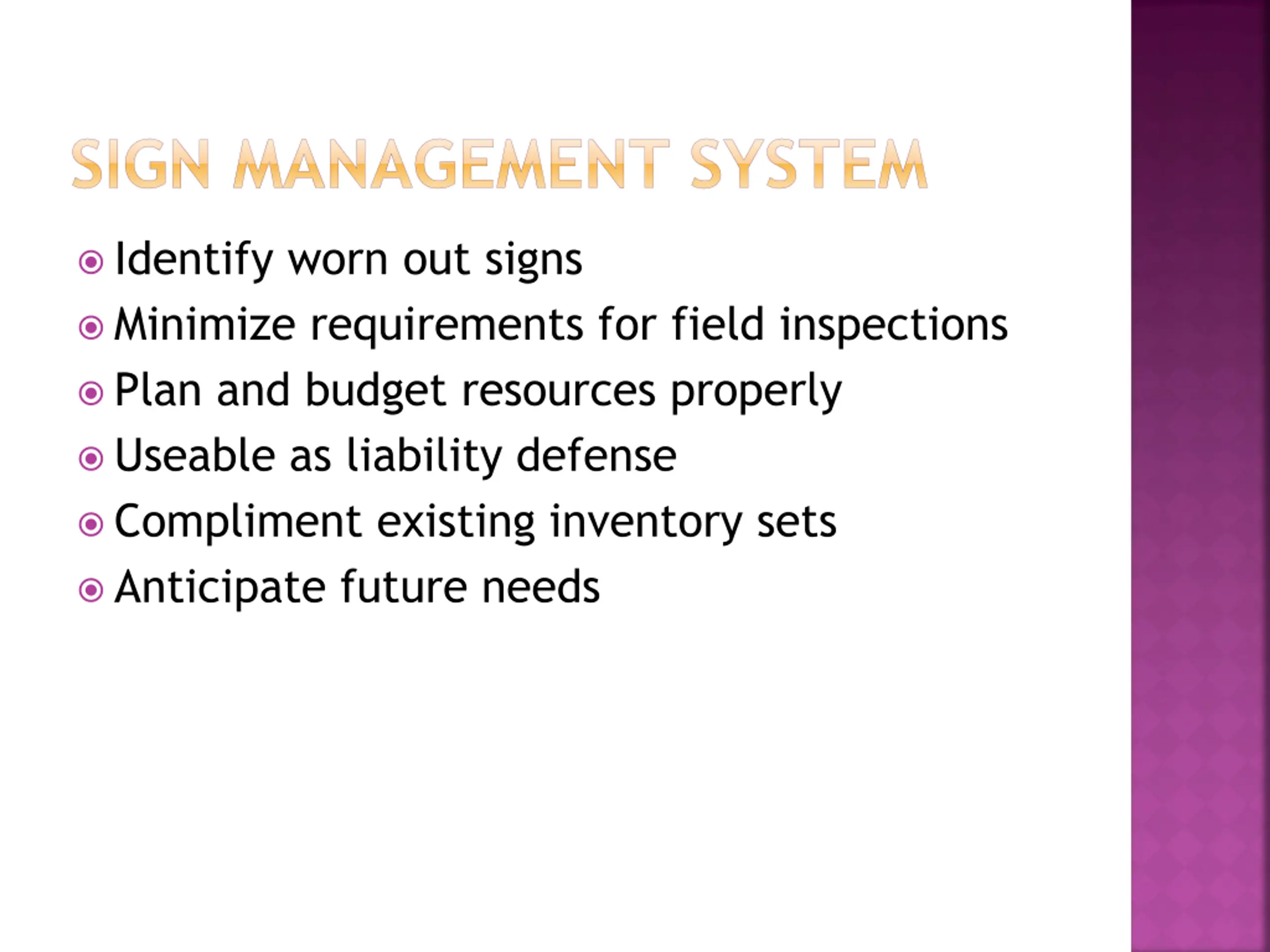SIGN MANAGEMENT SYSTEM Identify worn out signs Minimize requirements for field inspections Plan and budget resources properly Useable as liability defense Compliment existing inventory sets Anticipate future needs