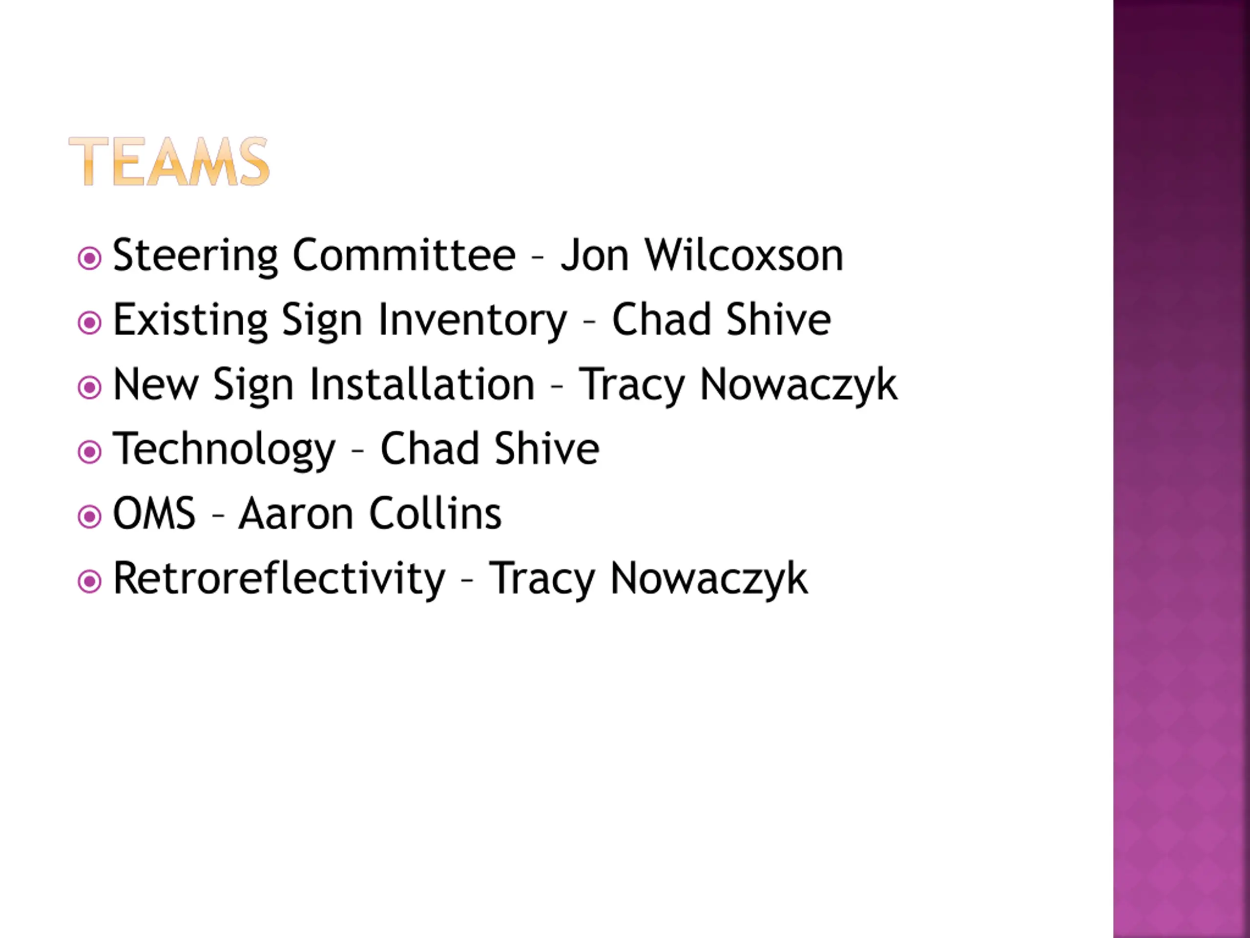 TEAMS Steering Committee Jon Wilcoxson Existing Sign Inventory Chad Shive New Sign Installation Tracy Nowaczyk Technology Chad Shive OMS Aaron Collins Retroreflectivity Tracy Nowaczyk