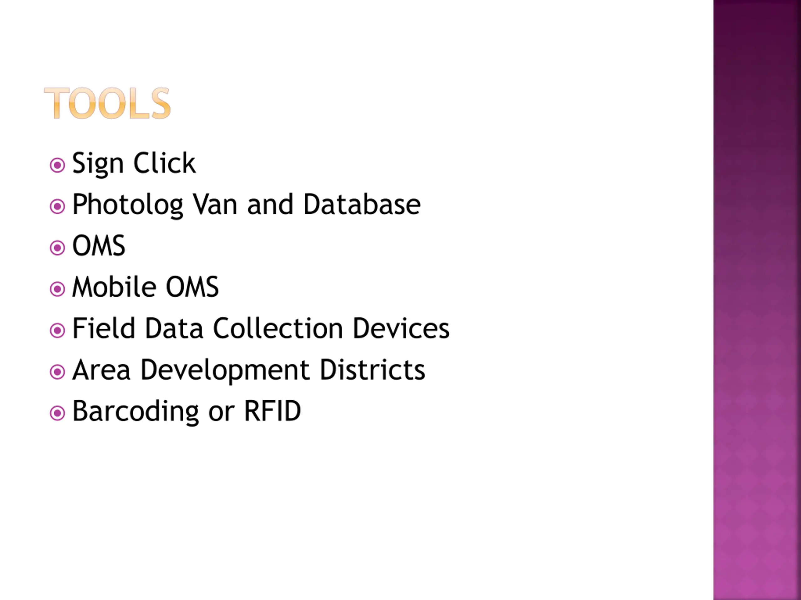 TOOLS Sign Click Photolog Van and Database OMS Mobile OMS Field Data Collection Devices Area Development Districts Barcoding or RFID