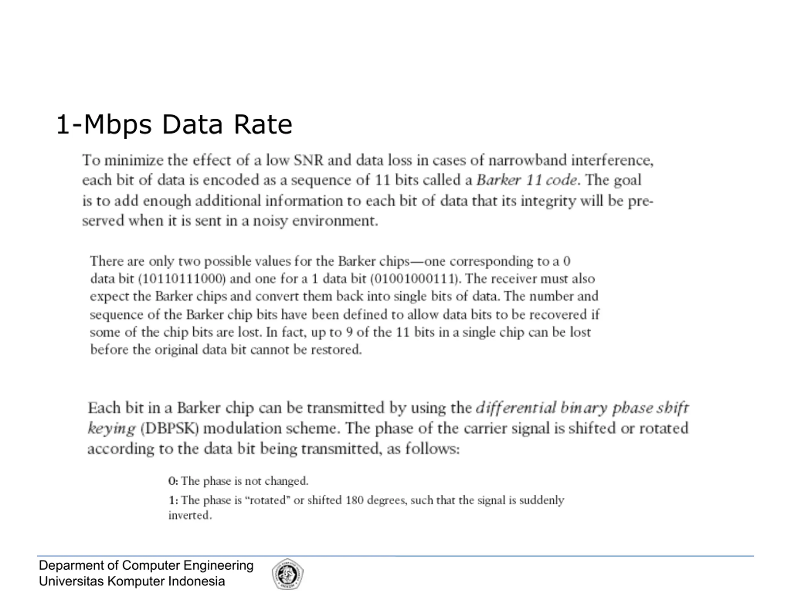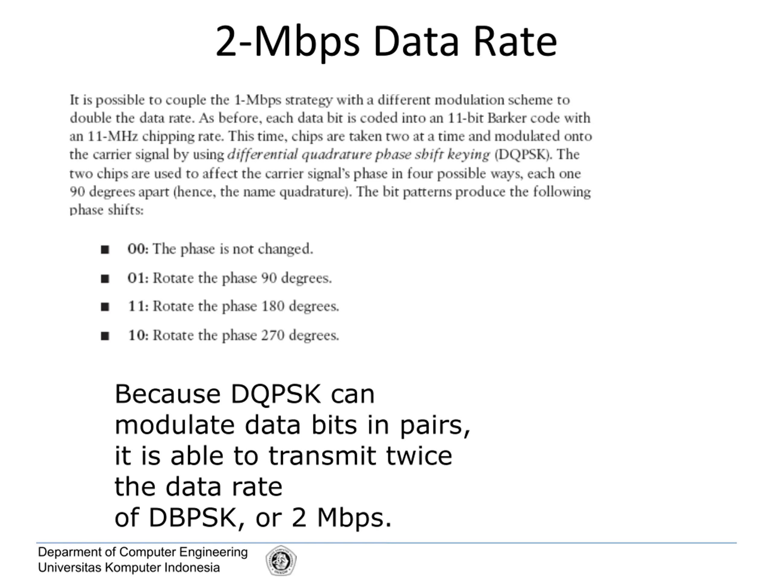 2-Mbps Data Rate Because DQPSK can modulate data bits in pairs, it is able to transmit twice the data rate of DBPSK, or 2 Mbps. Deparment of Computer Engineering Universitas Komputer Indonesia