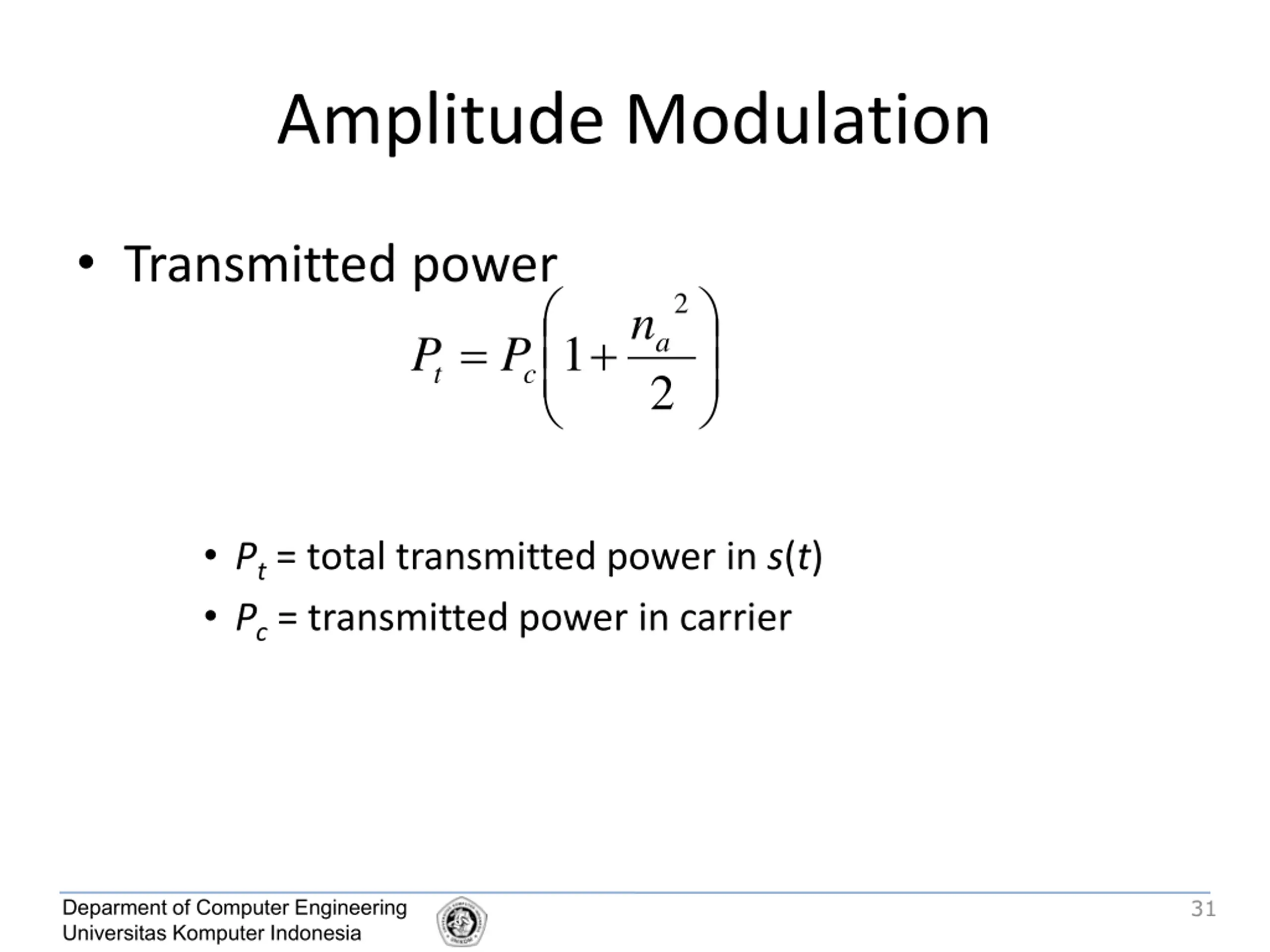 Amplitude Modulation Transmitted power 2 n = + 1 a P P t c 2 Pt = total transmitted power in s(t) Pc = transmitted power in carrier Deparment of Computer Engineering Universitas Komputer Indonesia 31