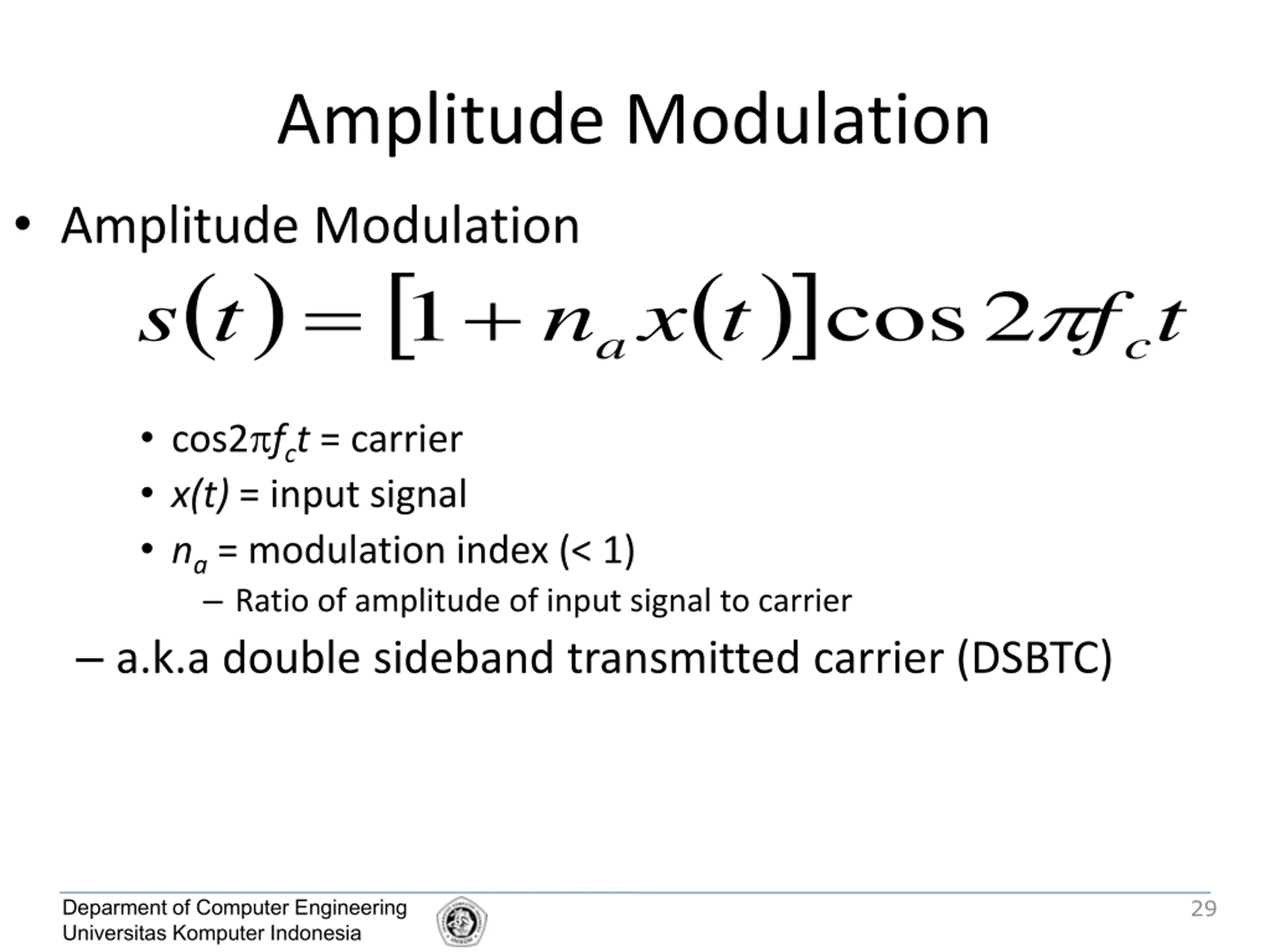 Amplitude Modulation Amplitude Modulation ( ) t s ( ) t = 1+ 2 cos n x f t a c cos2 fct = carrier x(t) = input signal na = modulation index (< 1) Ratio of amplitude of input signal to carrier a.k.a double sideband transmitted carrier (DSBTC) Deparment of Computer Engineering Universitas Komputer Indonesia 29