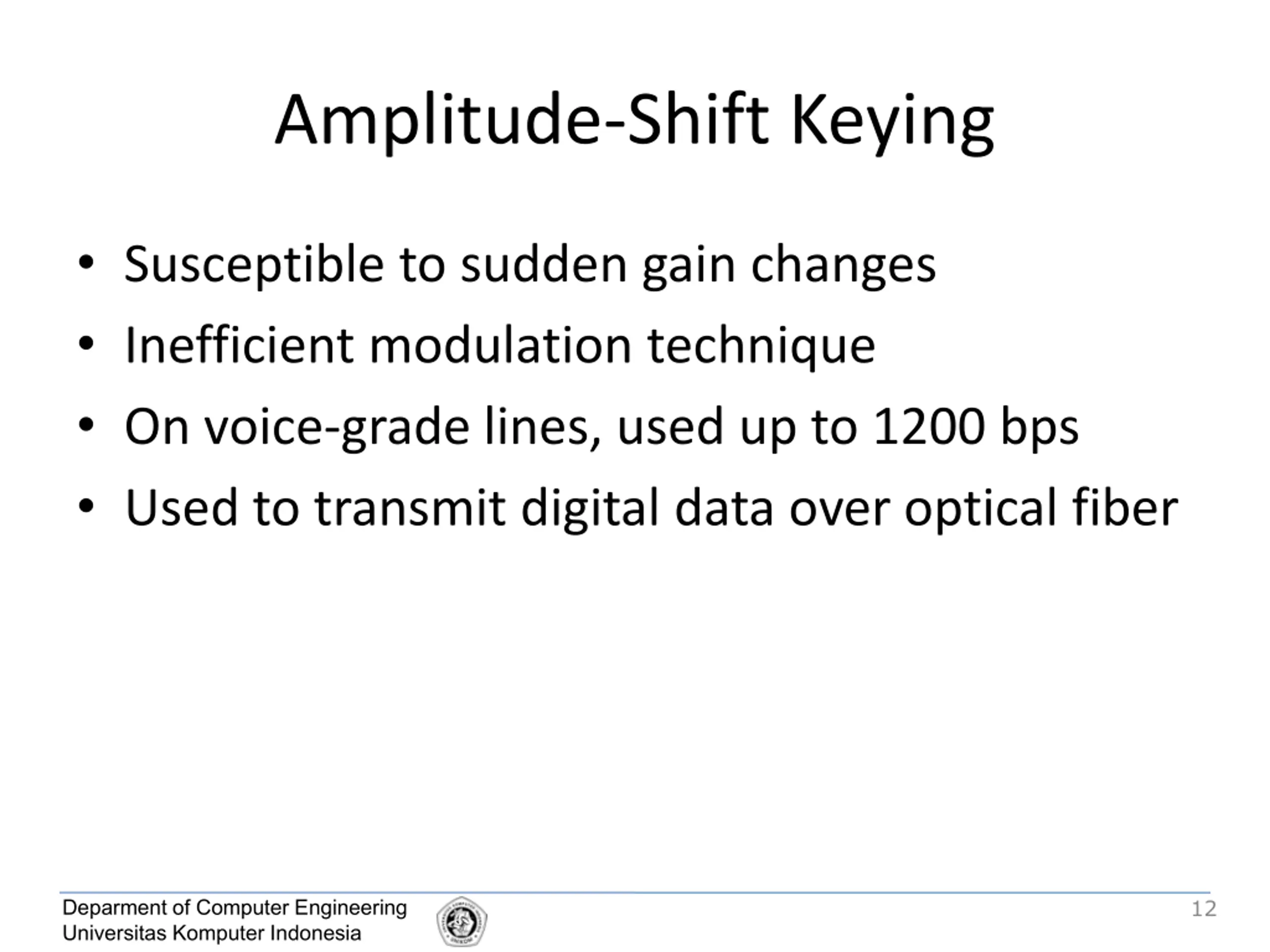 Amplitude-Shift Keying Susceptible to sudden gain changes Inefficient modulation technique On voice-grade lines, used up to 1200 bps Used to transmit digital data over optical fiber Deparment of Computer Engineering Universitas Komputer Indonesia 12