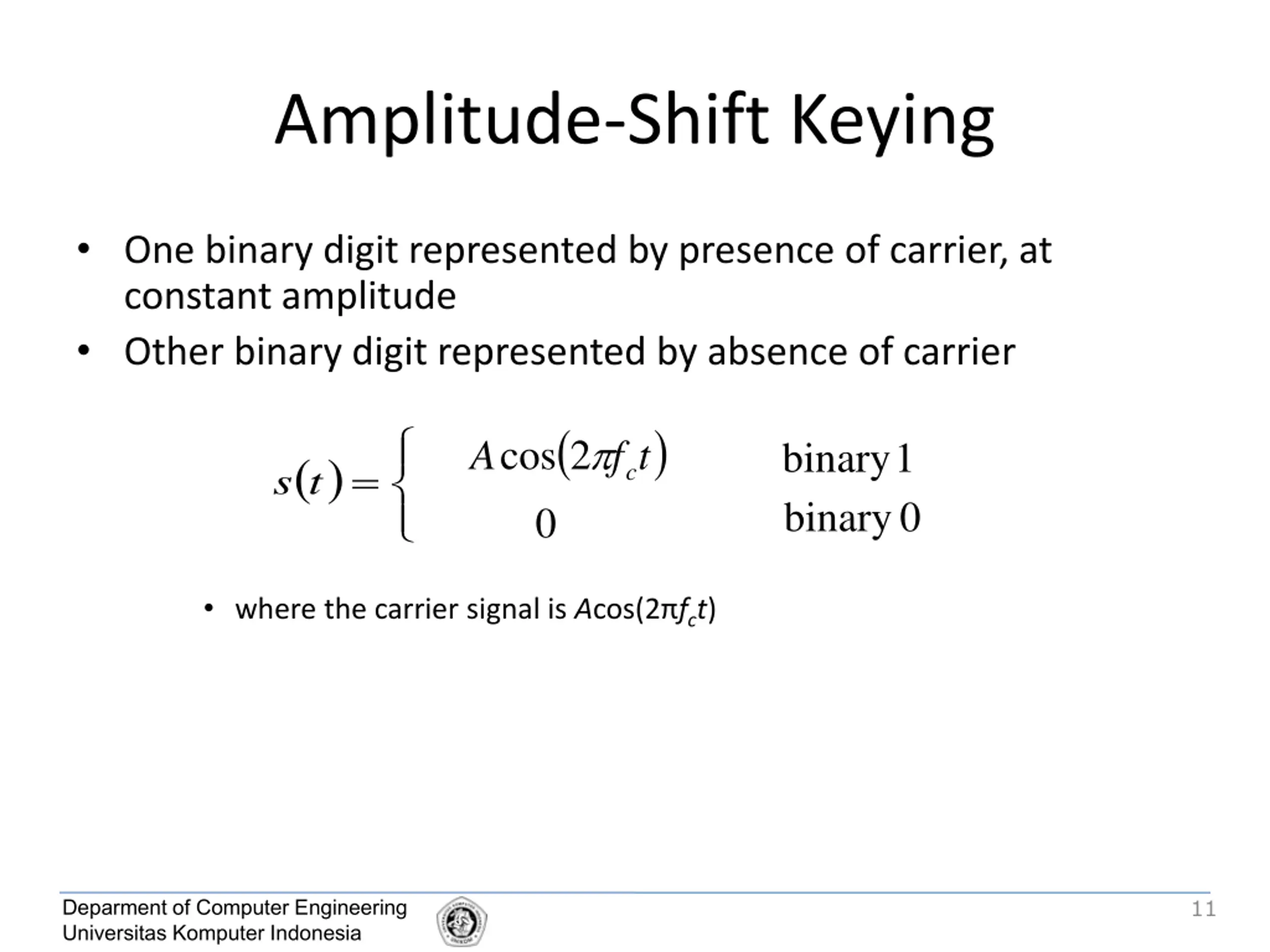 Amplitude-Shift Keying One binary digit represented by presence of carrier, at constant amplitude Other binary digit represented by absence of carrier ( ) t f c 2 cos A binary binary 1 0 ( ) t = s 0 where the carrier signal is Acos(2 fct) Deparment of Computer Engineering Universitas Komputer Indonesia 11