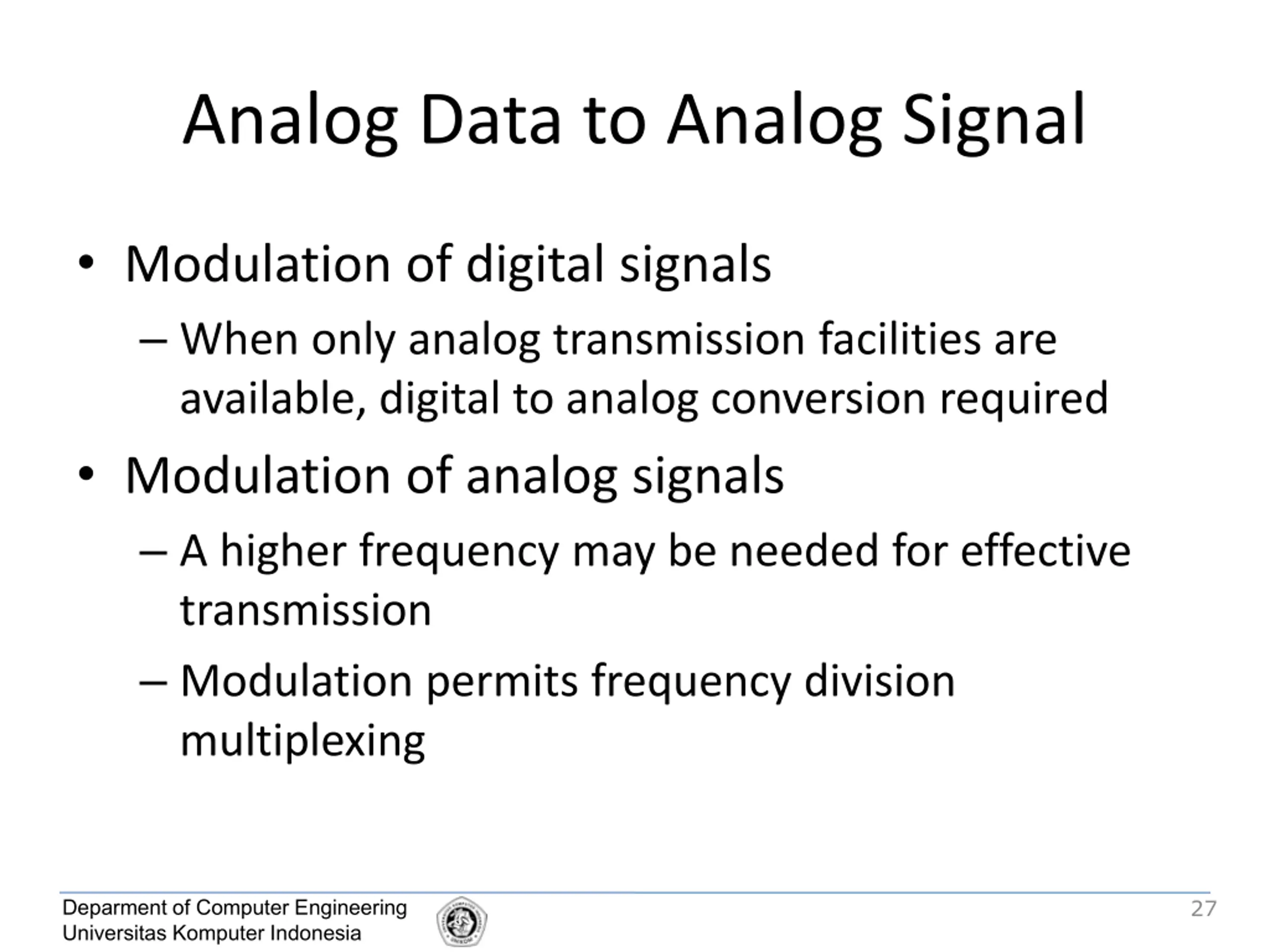 Analog Data to Analog Signal Modulation of digital signals When only analog transmission facilities are available, digital to analog conversion required Modulation of analog signals A higher frequency may be needed for effective transmission Modulation permits frequency division multiplexing Deparment of Computer Engineering Universitas Komputer Indonesia 27