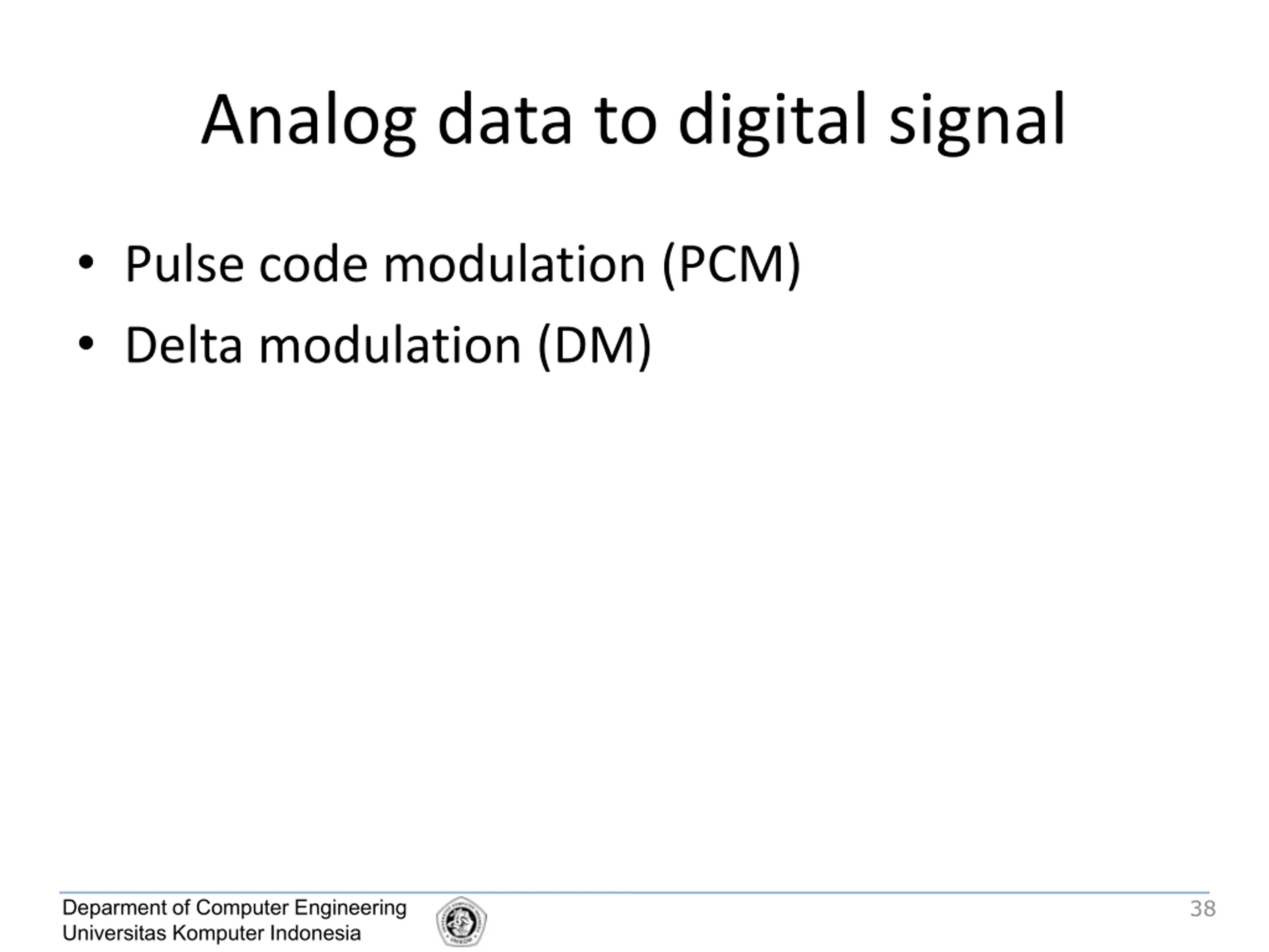 Analog data to digital signal Pulse code modulation (PCM) Delta modulation (DM) Deparment of Computer Engineering Universitas Komputer Indonesia 38