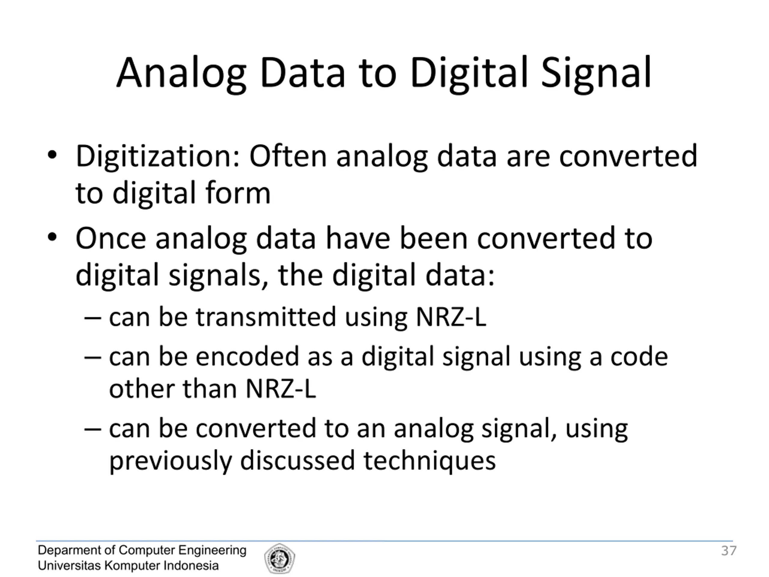 Analog Data to Digital Signal Digitization: Often analog data are converted to digital form Once analog data have been converted to digital signals, the digital data: can be transmitted using NRZ-L can be encoded as a digital signal using a code other than NRZ-L can be converted to an analog signal, using previously discussed techniques Deparment of Computer Engineering Universitas Komputer Indonesia 37