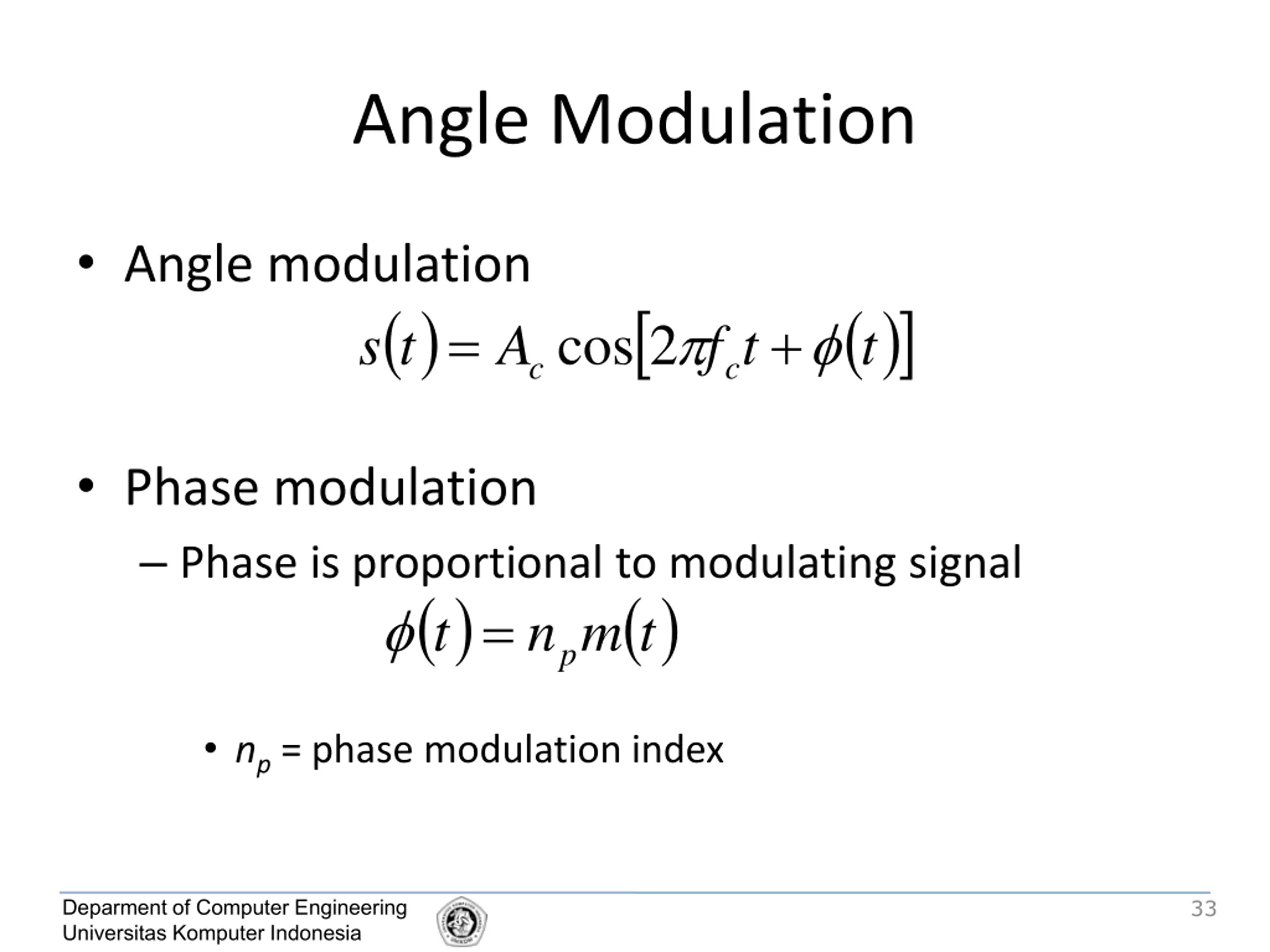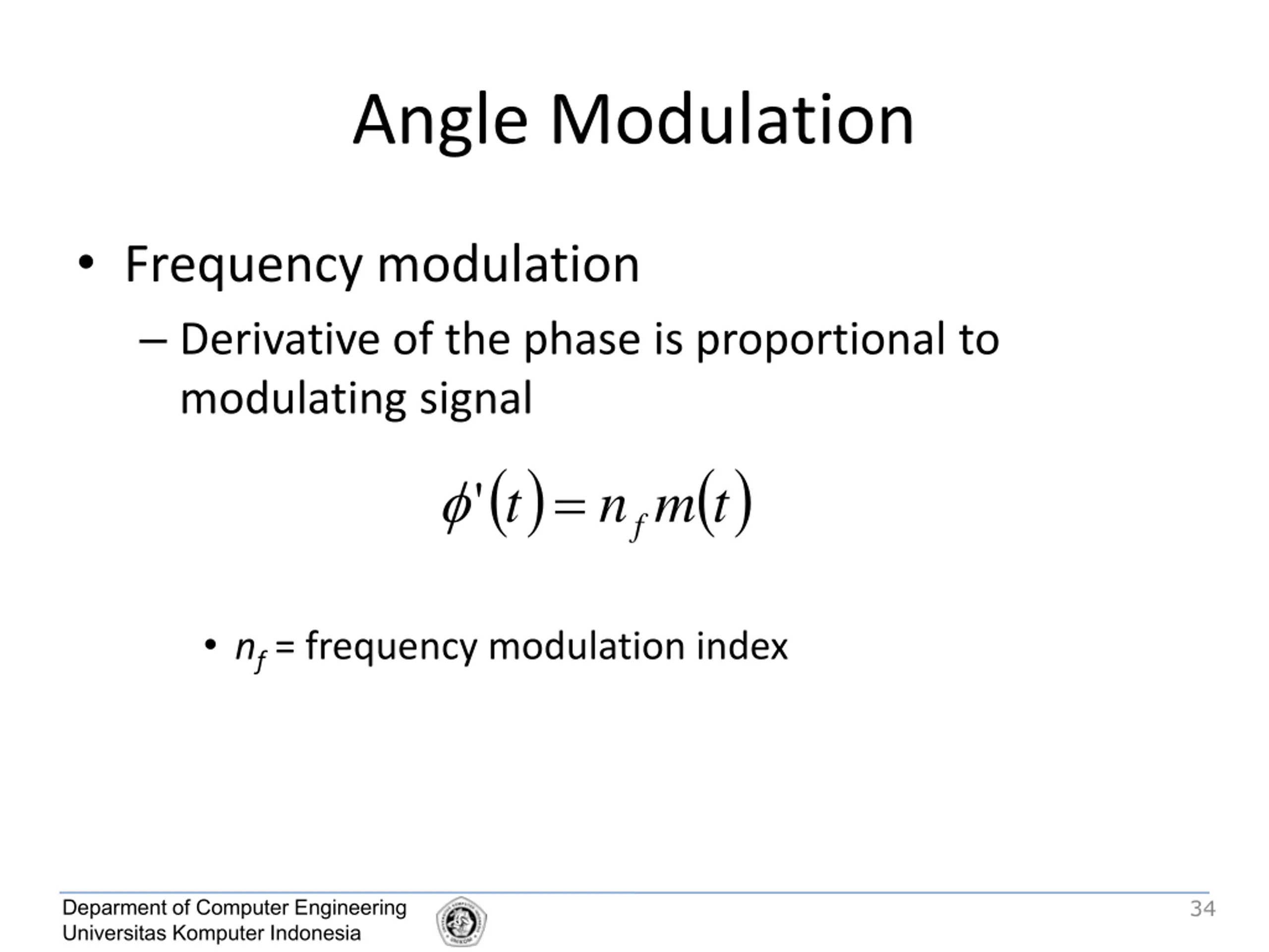 Angle Modulation Angle modulation ( ) t ( ) t = t f c 2 + cos s A c Phase modulation Phase is proportional to modulating signal ( ) n t = ( ) t m p np = phase modulation index Deparment of Computer Engineering Universitas Komputer Indonesia 33