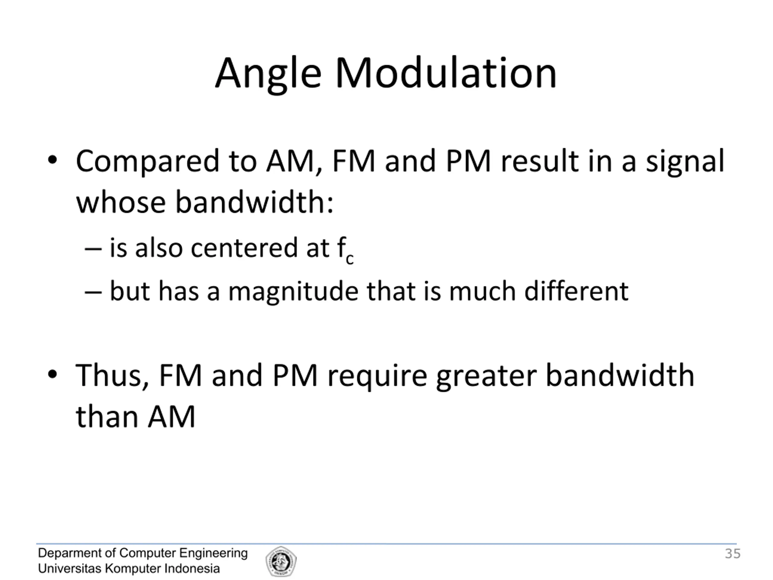Angle Modulation Compared to AM, FM and PM result in a signal whose bandwidth: is also centered at fc but has a magnitude that is much different Thus, FM and PM require greater bandwidth than AM Deparment of Computer Engineering Universitas Komputer Indonesia 35