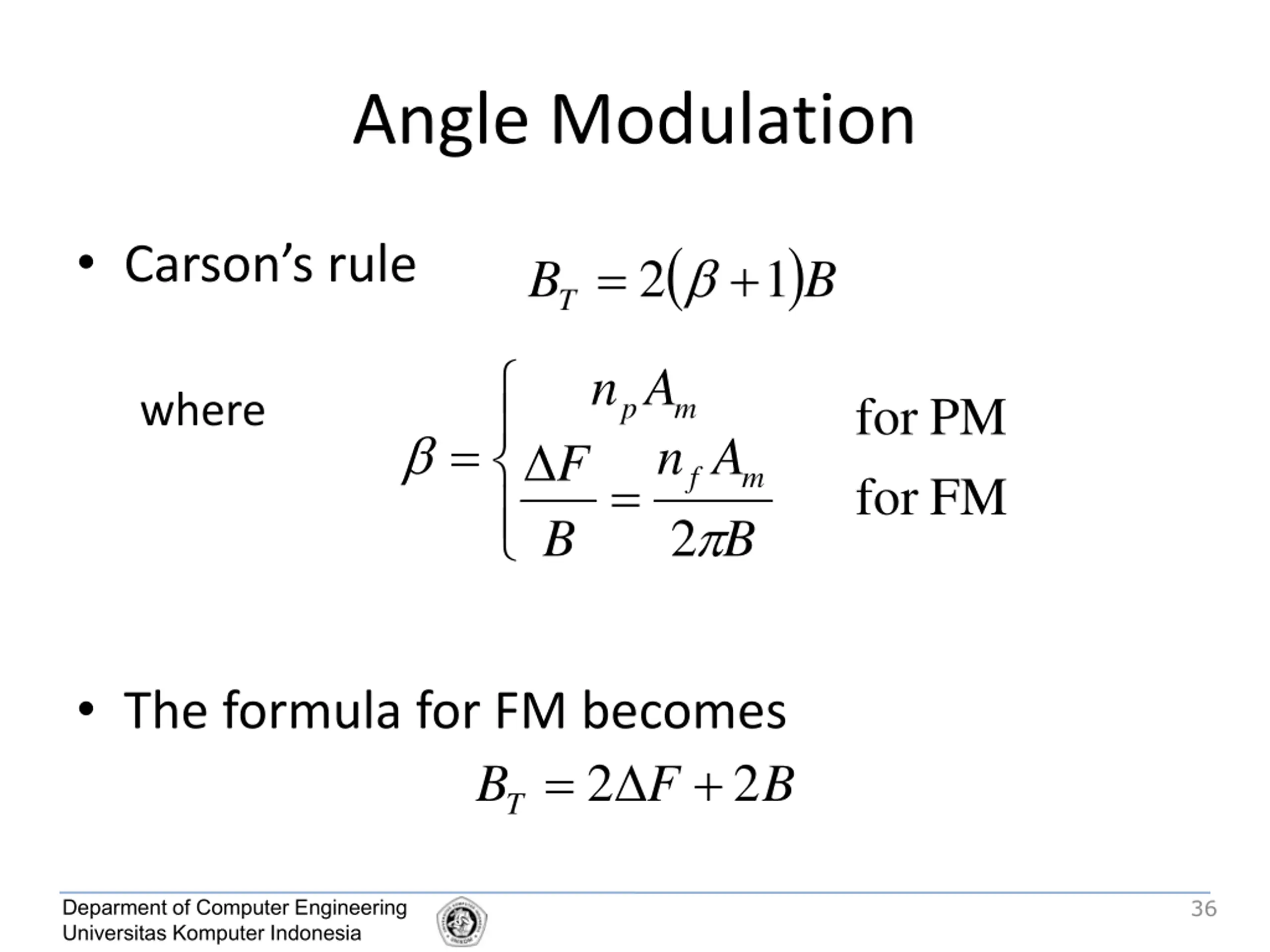 Angle Modulation ( )B 1 Carson s rule = + 2 BT n A for PM where p m = n A F f m = for FM 2 B B The formula for FM becomes = + 2 2 BT F B Deparment of Computer Engineering Universitas Komputer Indonesia 36