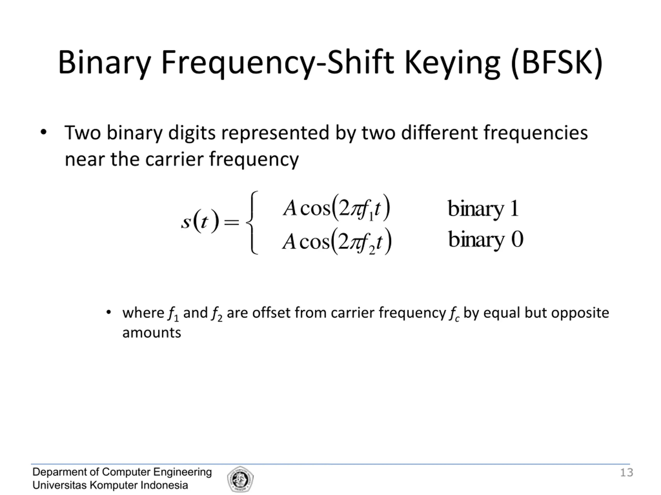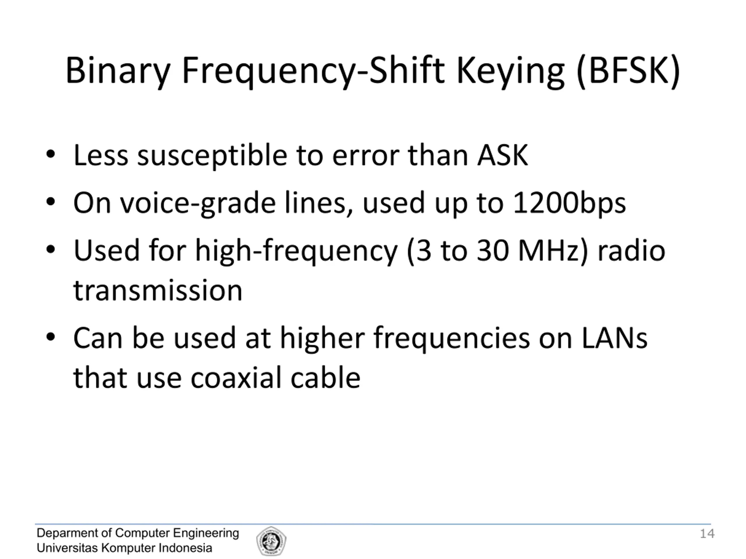 Binary Frequency-Shift Keying (BFSK) Two binary digits represented by two different frequencies near the carrier frequency ( ( ) t f 1 ) t f 2 cos cos 2 2 binary binary 1 0 A A ( ) t = s where f1 and f2 are offset from carrier frequency fc by equal but opposite amounts Deparment of Computer Engineering Universitas Komputer Indonesia 13