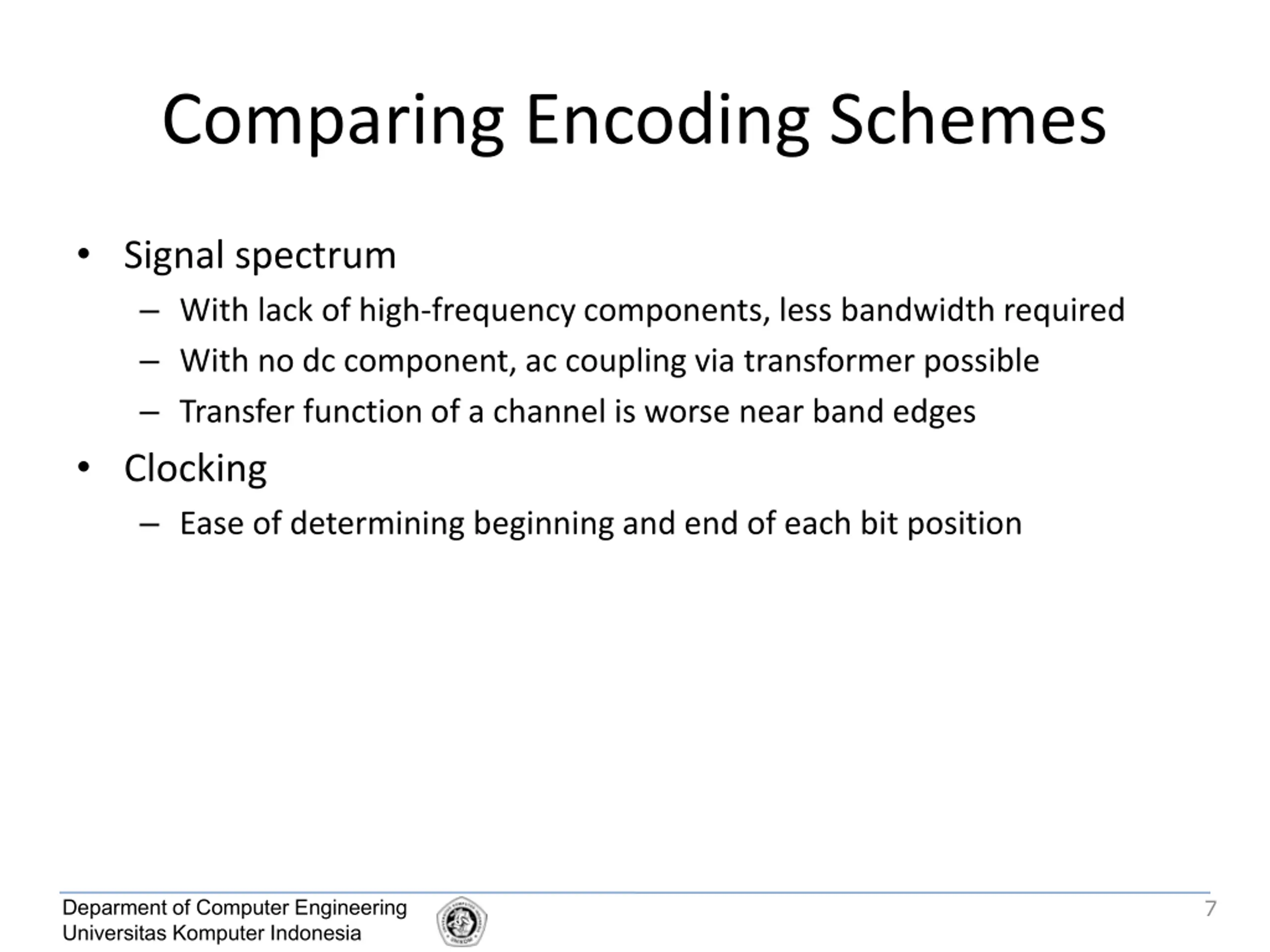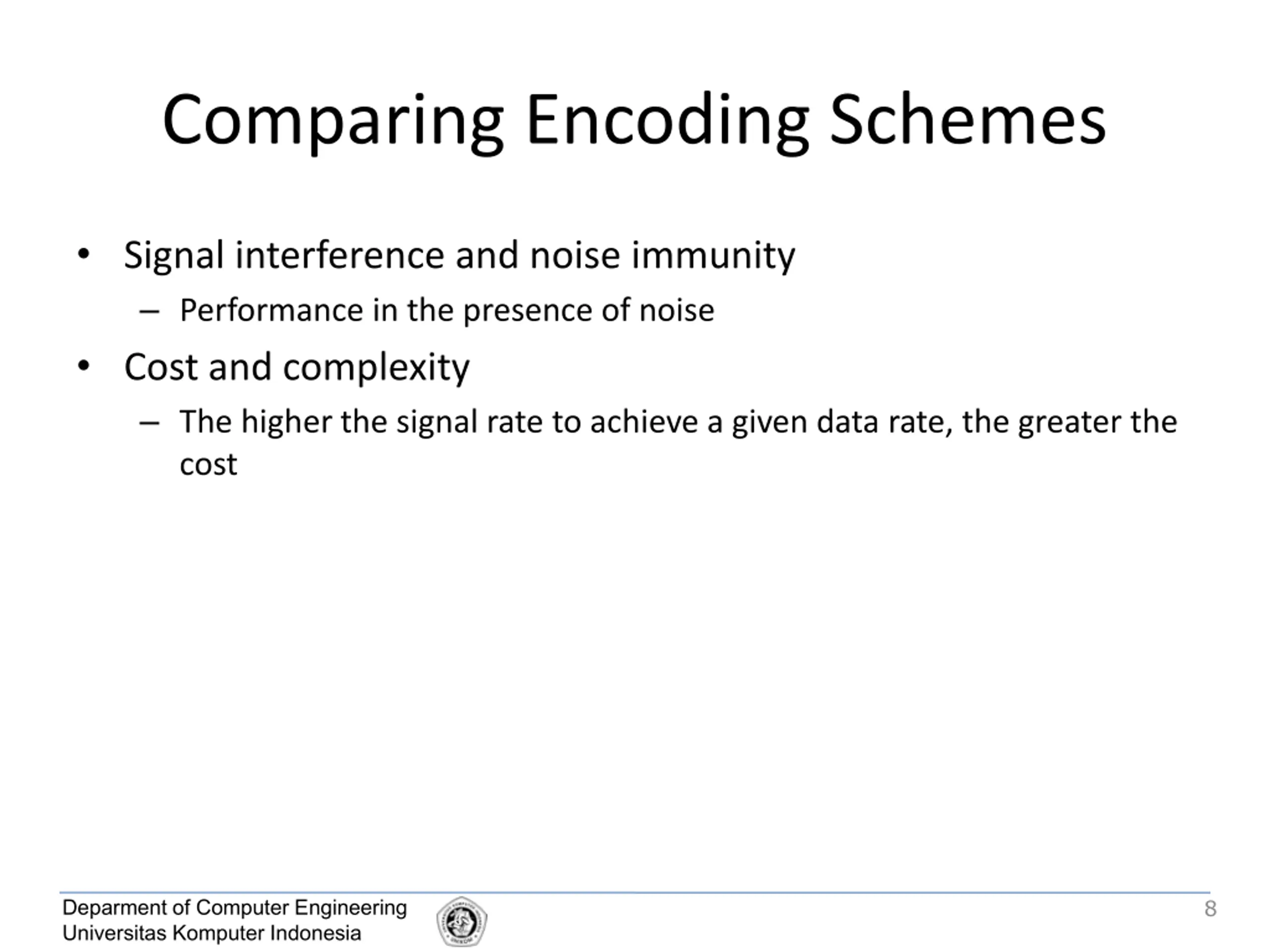 Comparing Encoding Schemes Signal spectrum With lack of high-frequency components, less bandwidth required With no dc component, ac coupling via transformer possible Transfer function of a channel is worse near band edges Clocking Ease of determining beginning and end of each bit position Deparment of Computer Engineering Universitas Komputer Indonesia 7