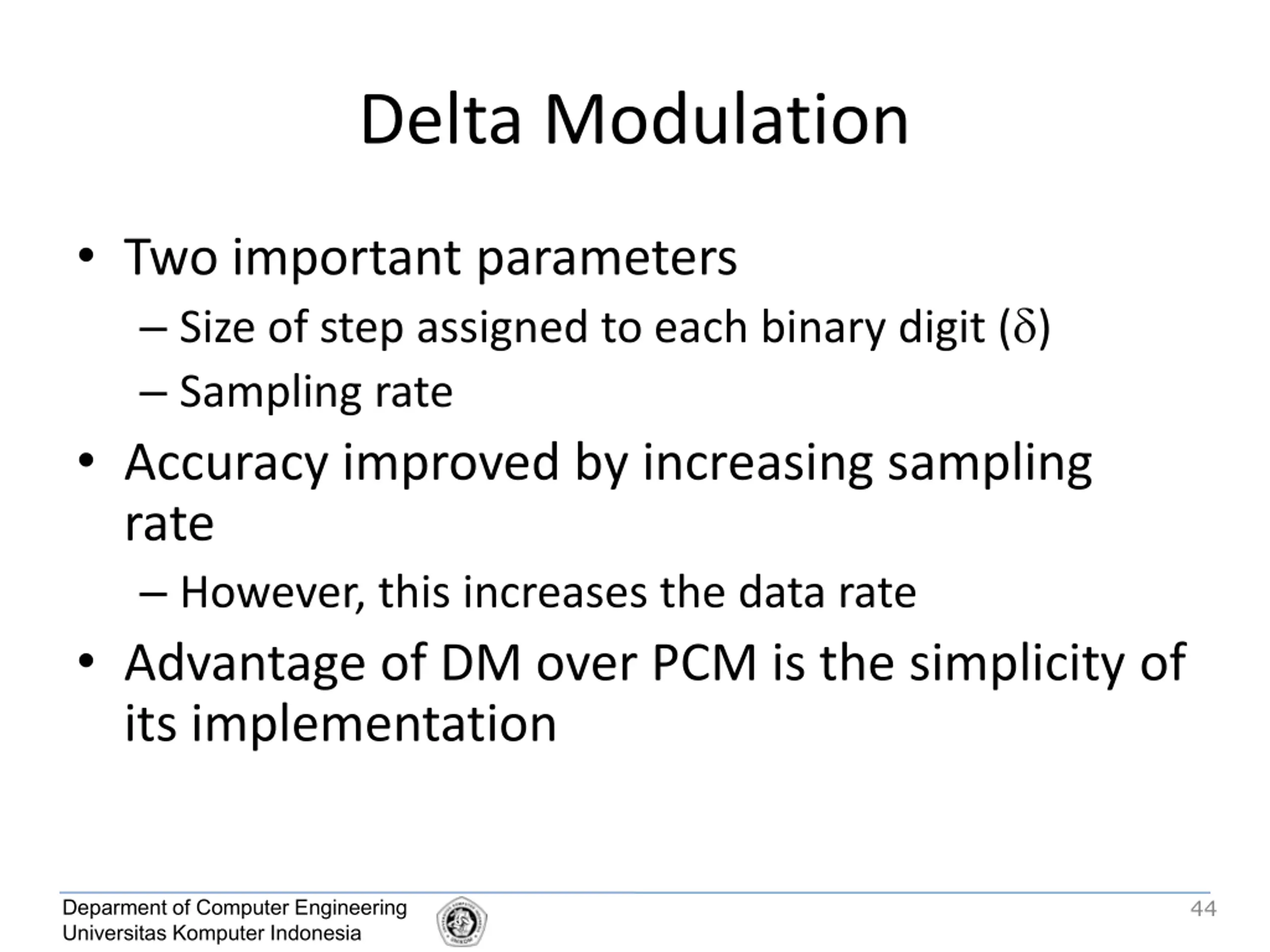 Delta Modulation Two important parameters Size of step assigned to each binary digit ( ) Sampling rate Accuracy improved by increasing sampling rate However, this increases the data rate Advantage of DM over PCM is the simplicity of its implementation Deparment of Computer Engineering Universitas Komputer Indonesia 44