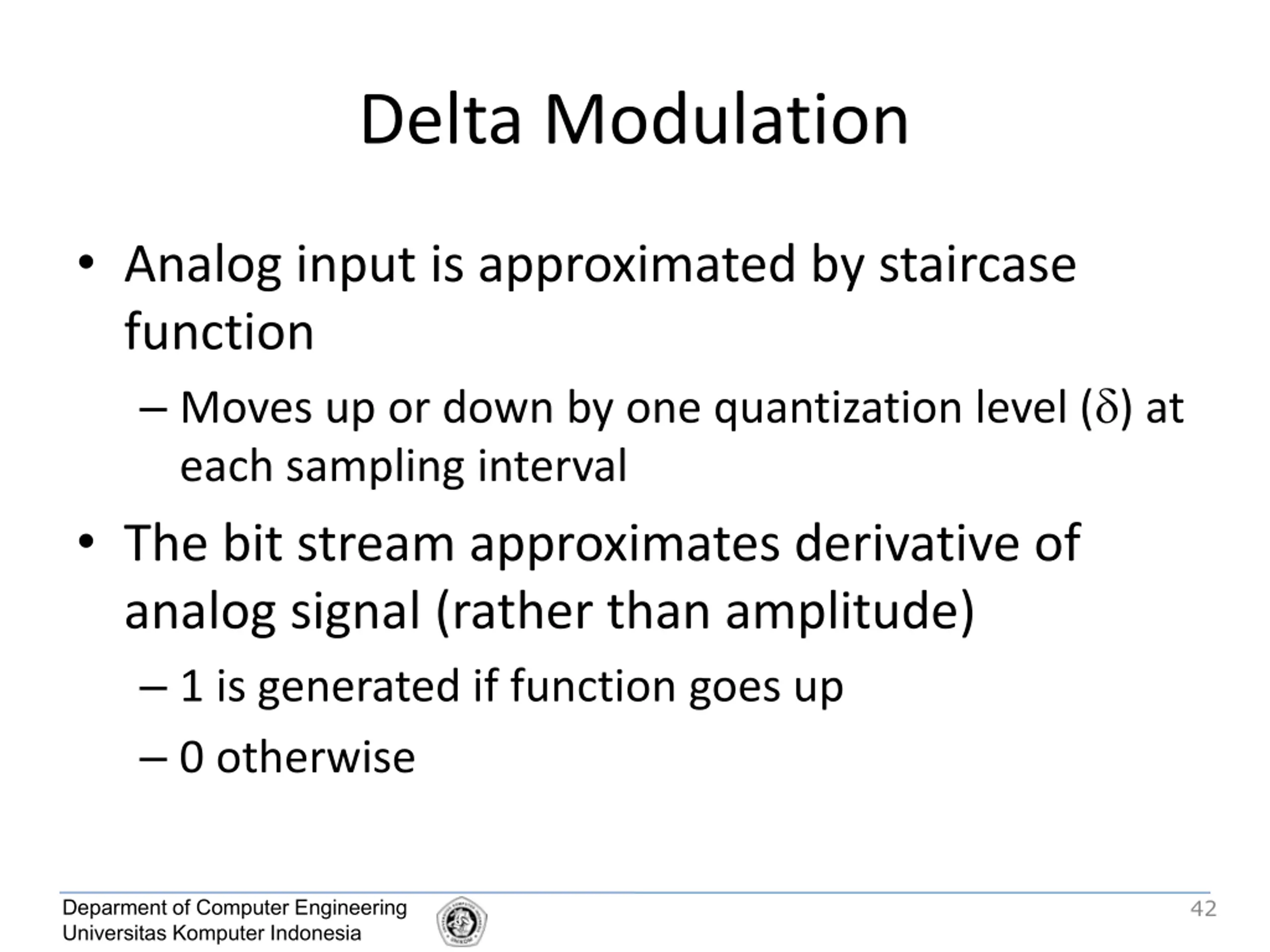 Delta Modulation Analog input is approximated by staircase function Moves up or down by one quantization level ( ) at each sampling interval The bit stream approximates derivative of analog signal (rather than amplitude) 1 is generated if function goes up 0 otherwise Deparment of Computer Engineering Universitas Komputer Indonesia 42