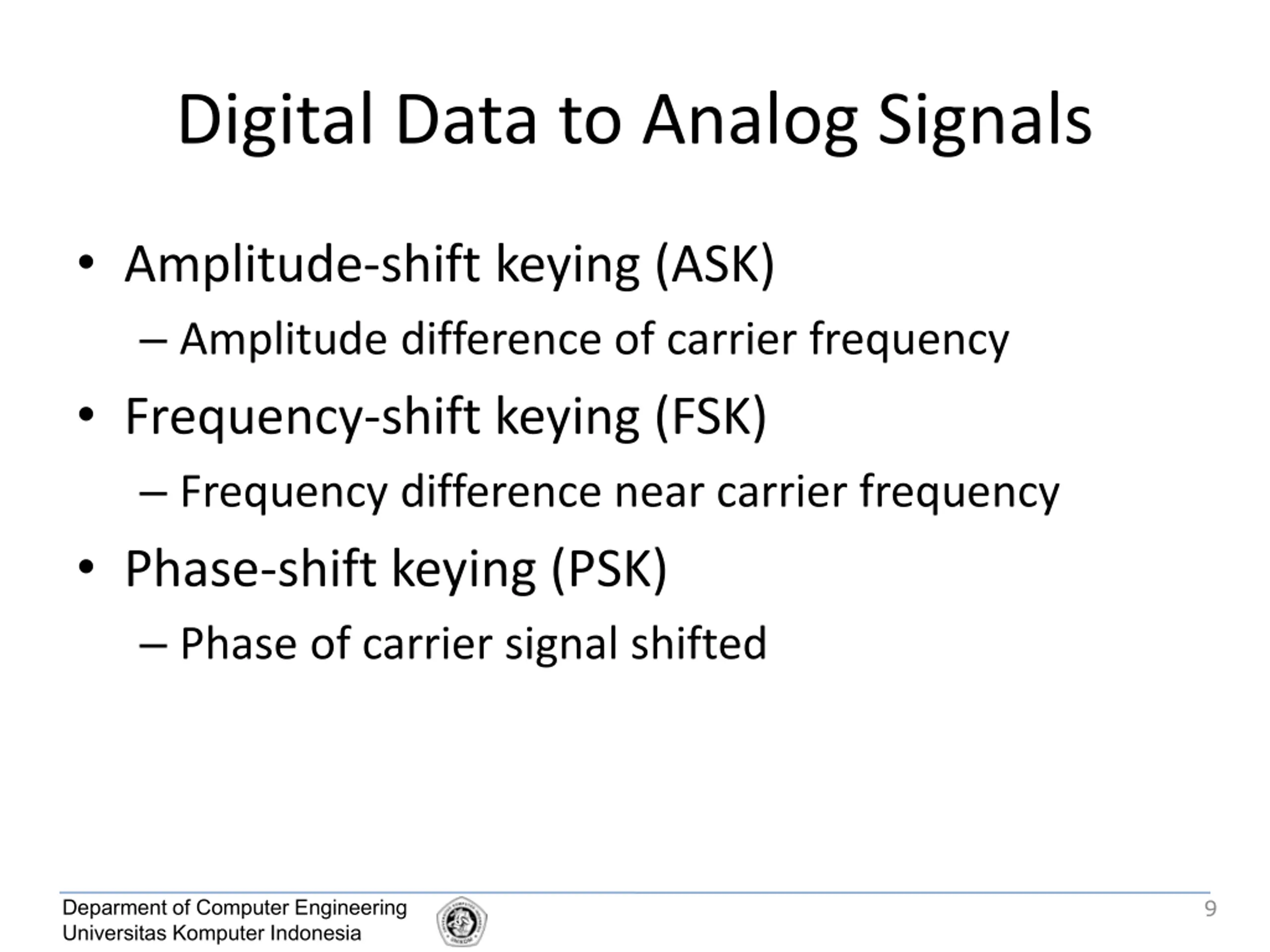 Digital Data to Analog Signals Amplitude-shift keying (ASK) Amplitude difference of carrier frequency Frequency-shift keying (FSK) Frequency difference near carrier frequency Phase-shift keying (PSK) Phase of carrier signal shifted Deparment of Computer Engineering Universitas Komputer Indonesia 9