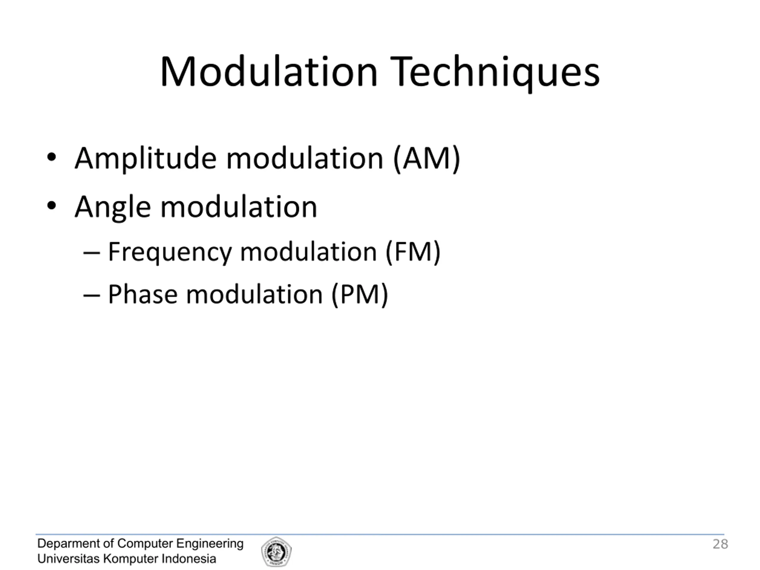 Modulation Techniques Amplitude modulation (AM) Angle modulation Frequency modulation (FM) Phase modulation (PM) Deparment of Computer Engineering Universitas Komputer Indonesia 28