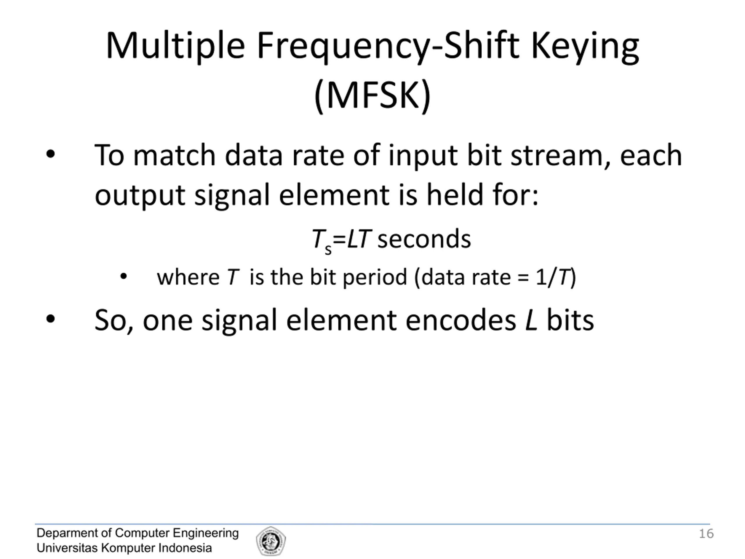 Multiple Frequency-Shift Keying (MFSK) More than two frequencies are used More bandwidth efficient but more susceptible to error ( ) t = 2 cos s A f t i 1 M i i f i= f c+ (2i 1 M)f d f c= the carrier frequency f d= the difference frequency M = number of different signal elements = 2 L L = number of bits per signal element Deparment of Computer Engineering Universitas Komputer Indonesia 15