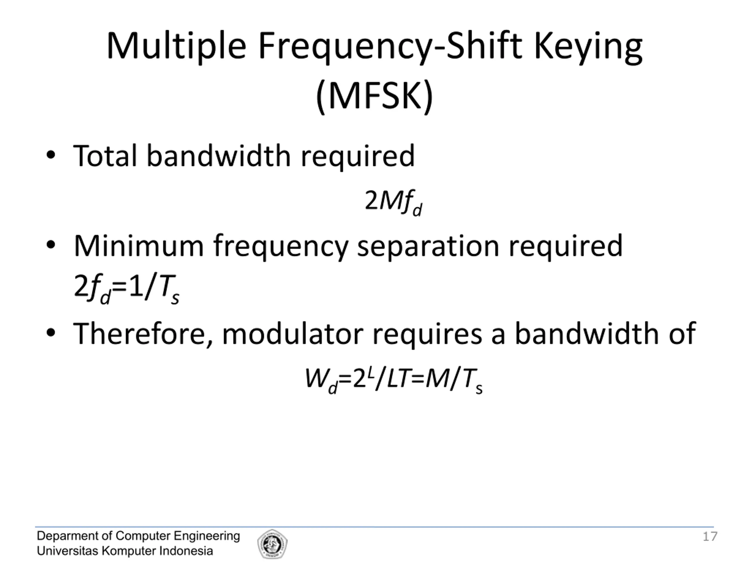 Multiple Frequency-Shift Keying (MFSK) Total bandwidth required 2Mfd Minimum frequency separation required 2fd=1/Ts Therefore, modulator requires a bandwidth of Wd=2L/LT=M/Ts Deparment of Computer Engineering Universitas Komputer Indonesia 17