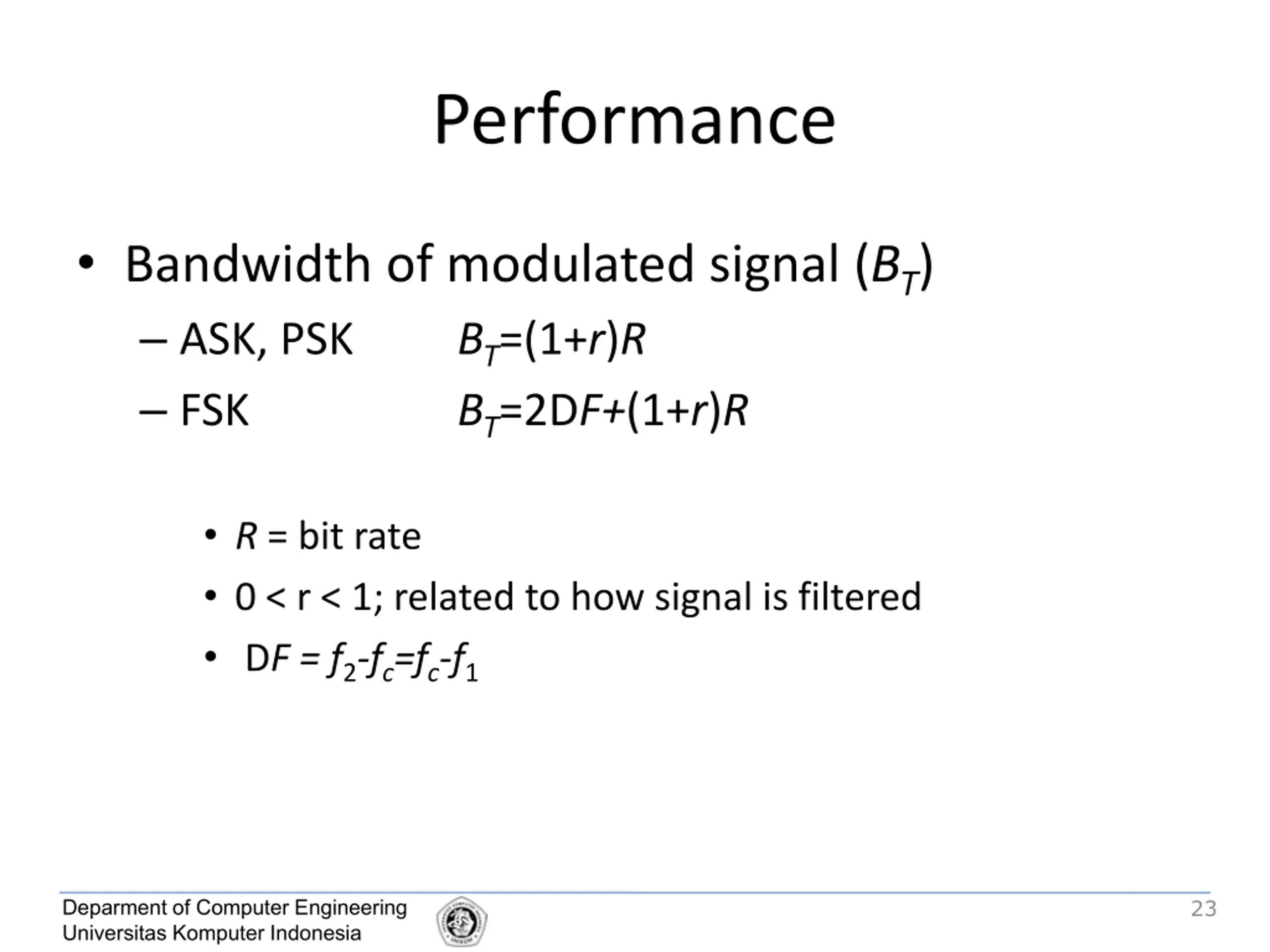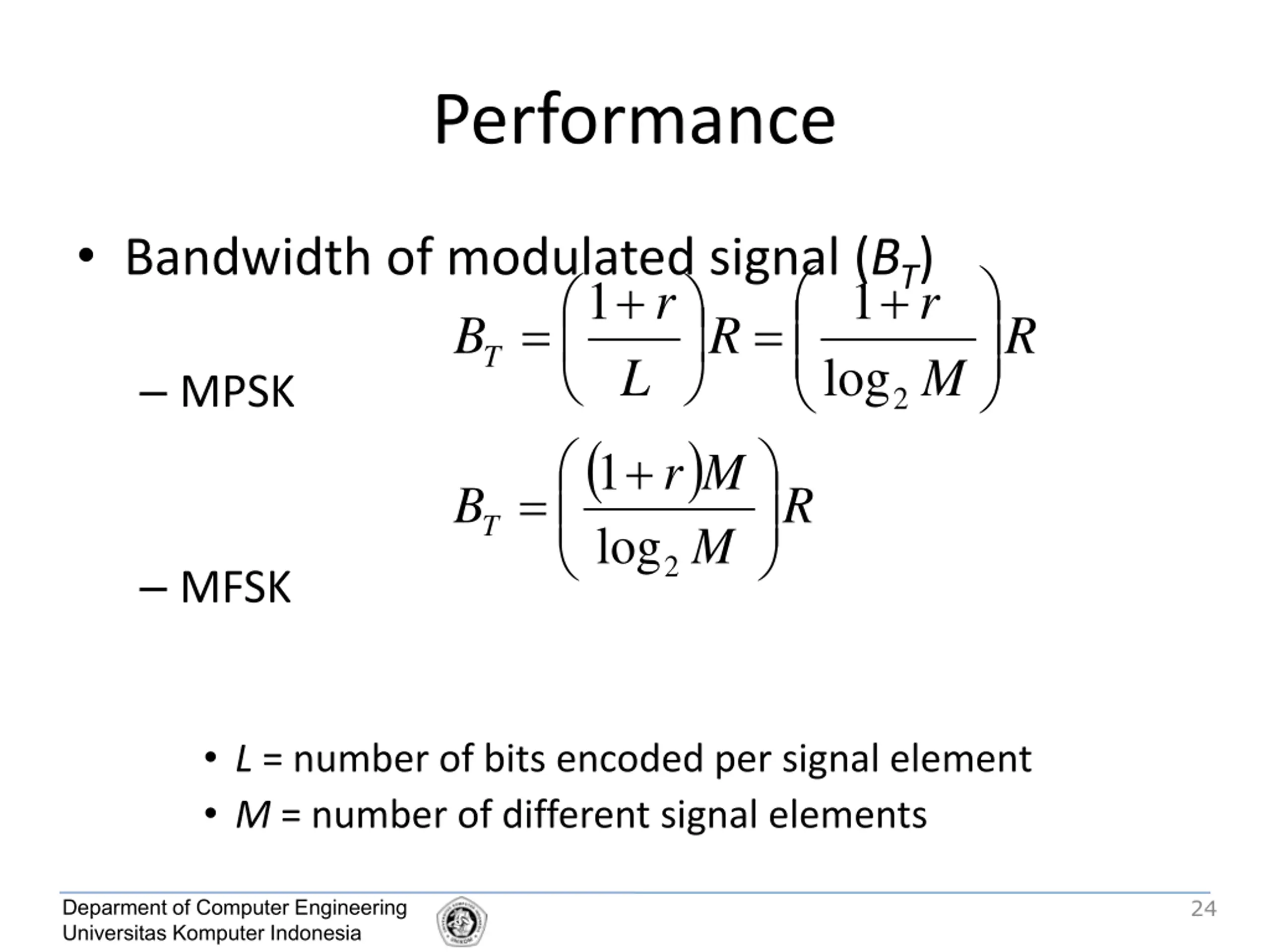 Performance Bandwidth of modulated signal (BT) ASK, PSK BT=(1+r)R FSK BT=2DF+(1+r)R R = bit rate 0 < r < 1; related to how signal is filtered DF = f2-fc=fc-f1 Deparment of Computer Engineering Universitas Komputer Indonesia 23