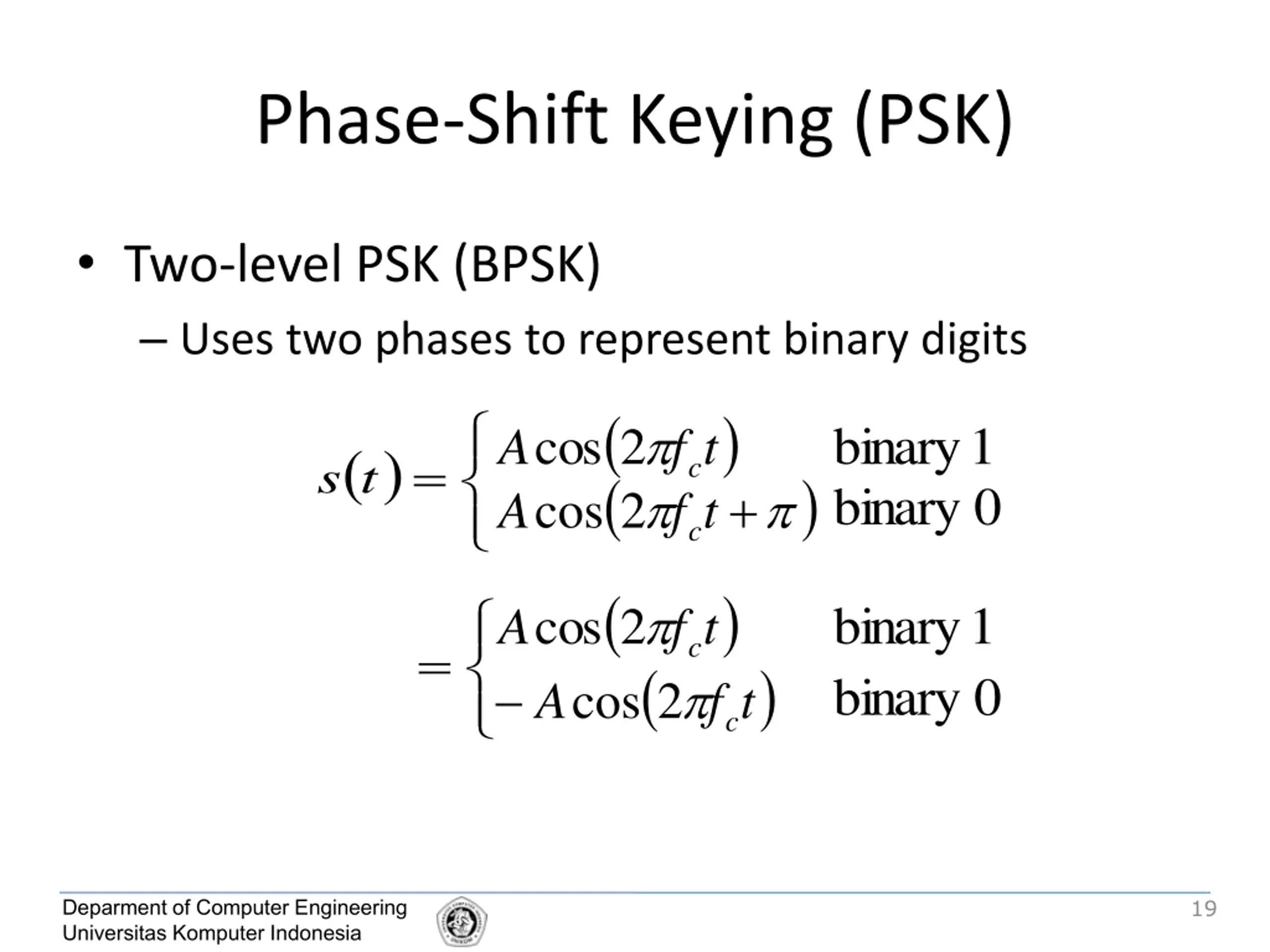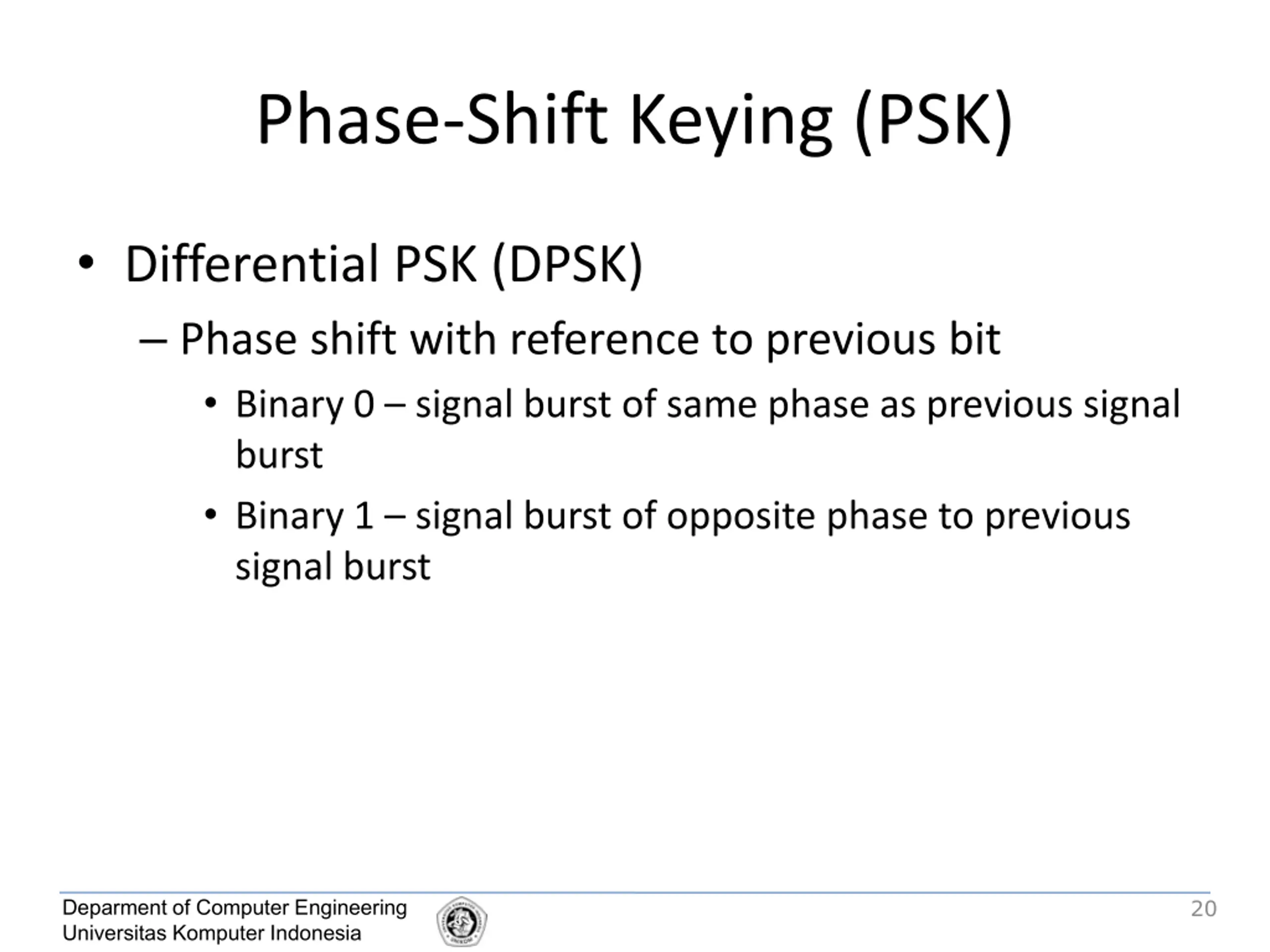 Phase-Shift Keying (PSK) Two-level PSK (BPSK) Uses two phases to represent binary digits ( ( ) t f c 2 t f 2 binary binary 1 0 cos cos A A ( ) t = s ) + c ) t f c 2 ( 2 cos ( binary binary 1 0 cos A A = ) t f c Deparment of Computer Engineering Universitas Komputer Indonesia 19