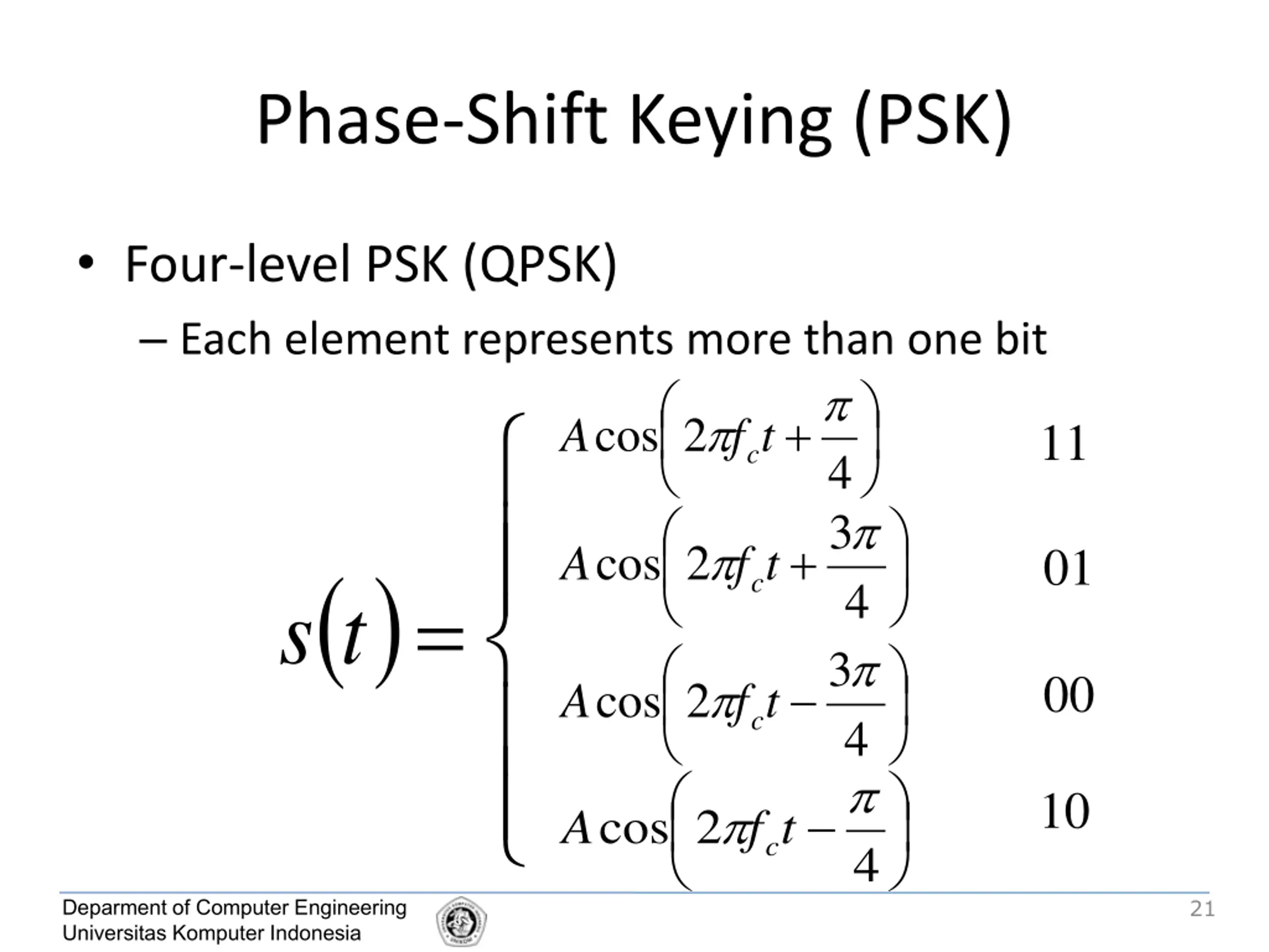 Phase-Shift Keying (PSK) Differential PSK (DPSK) Phase shift with reference to previous bit Binary 0 signal burst of same phase as previous signal burst Binary 1 signal burst of opposite phase to previous signal burst Deparment of Computer Engineering Universitas Komputer Indonesia 20
