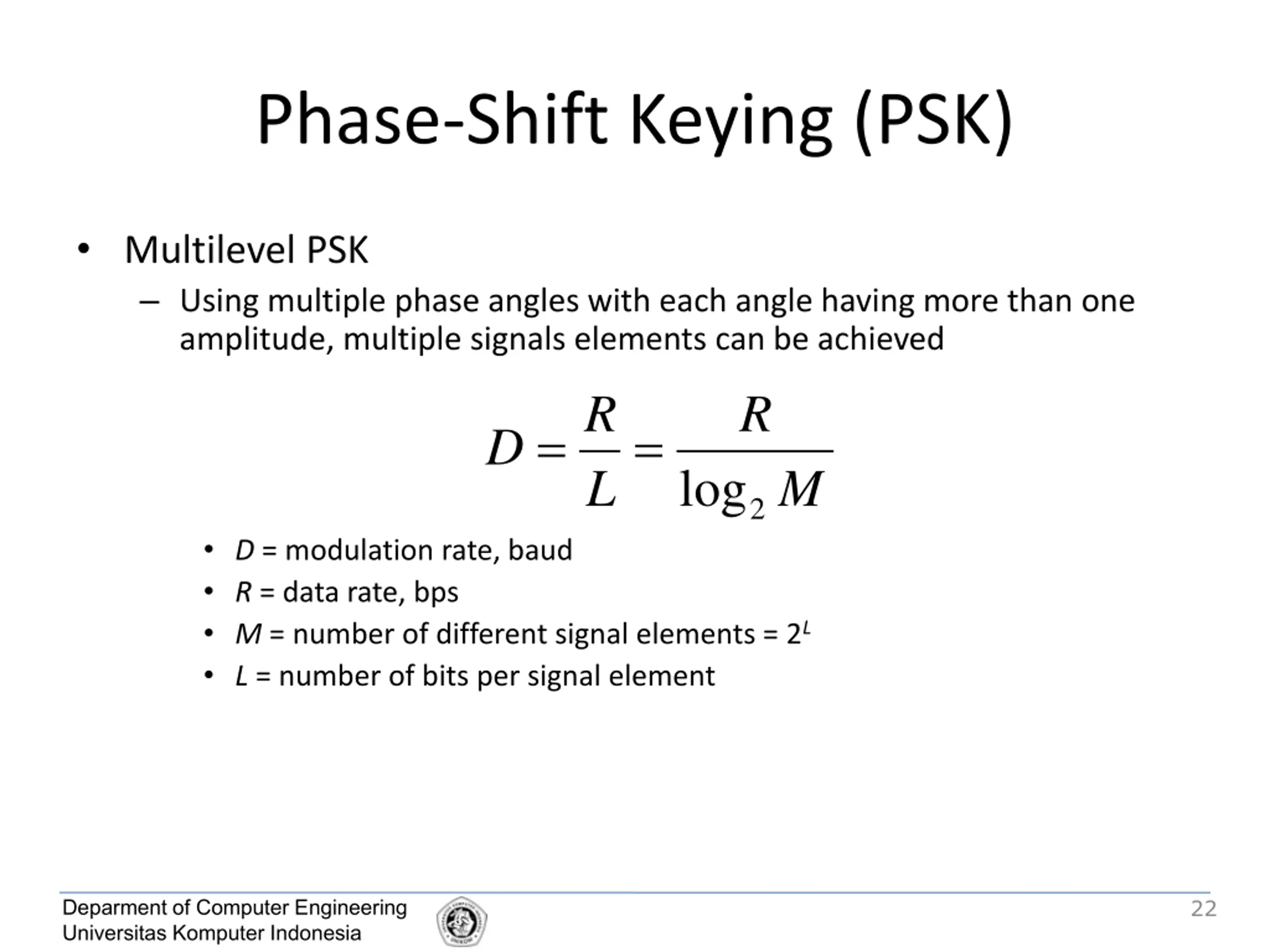 Phase-Shift Keying (PSK) Four-level PSK (QPSK) Each element represents more than one bit A t f +4 cos 2 A 11 c 3 t f + cos 2 01 ( ) t c = 4 s 3 00 t f cos 2 A c 4 10 t f 4 cos 2 A c Deparment of Computer Engineering Universitas Komputer Indonesia 21