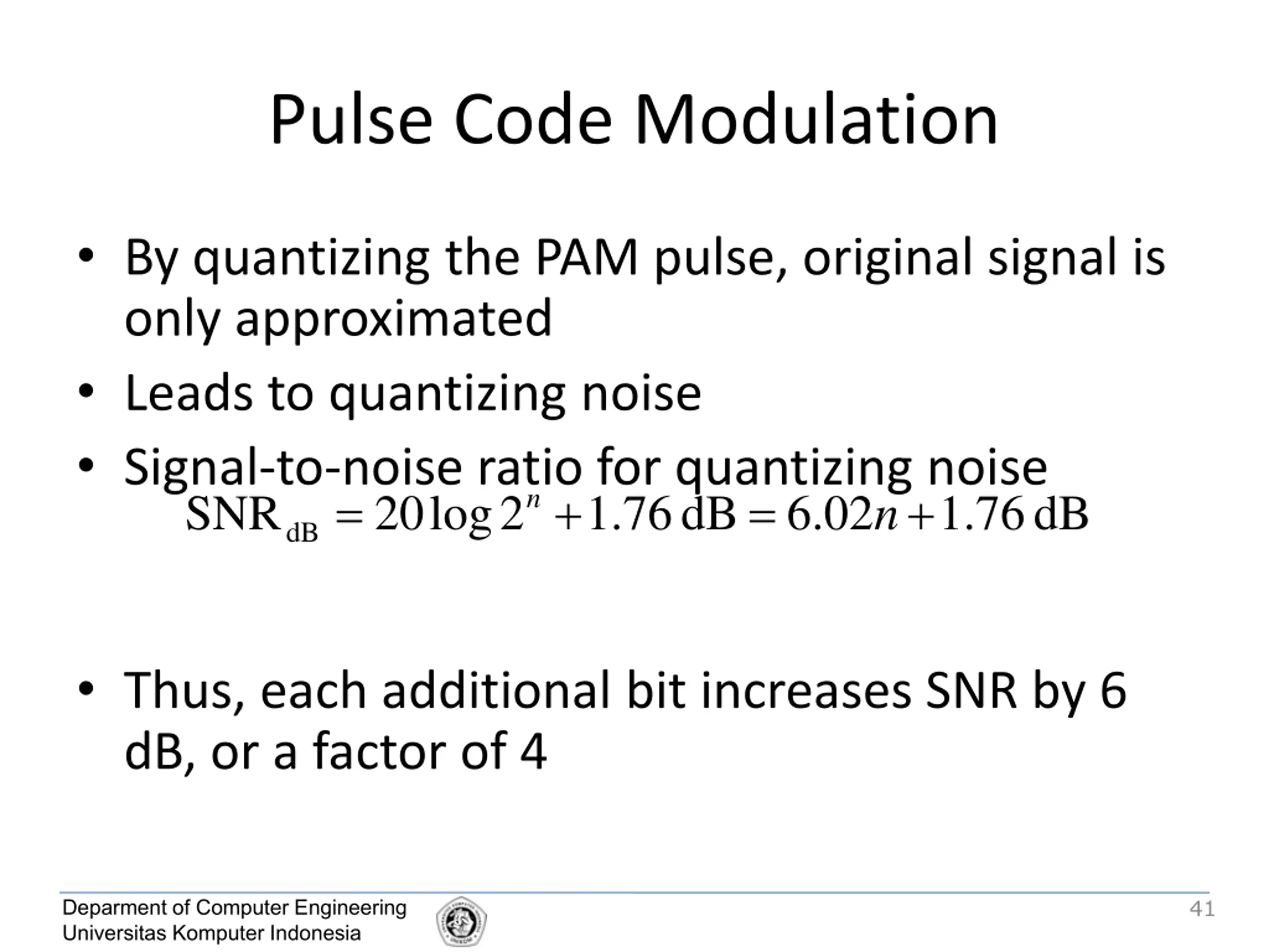 Pulse Code Modulation By quantizing the PAM pulse, original signal is only approximated Leads to quantizing noise Signal-to-noise ratio for quantizing noise 76 . 1 2 log 20 SNRdB + = = . 1 + n dB . 6 02 76 dB n Thus, each additional bit increases SNR by 6 dB, or a factor of 4 Deparment of Computer Engineering Universitas Komputer Indonesia 41
