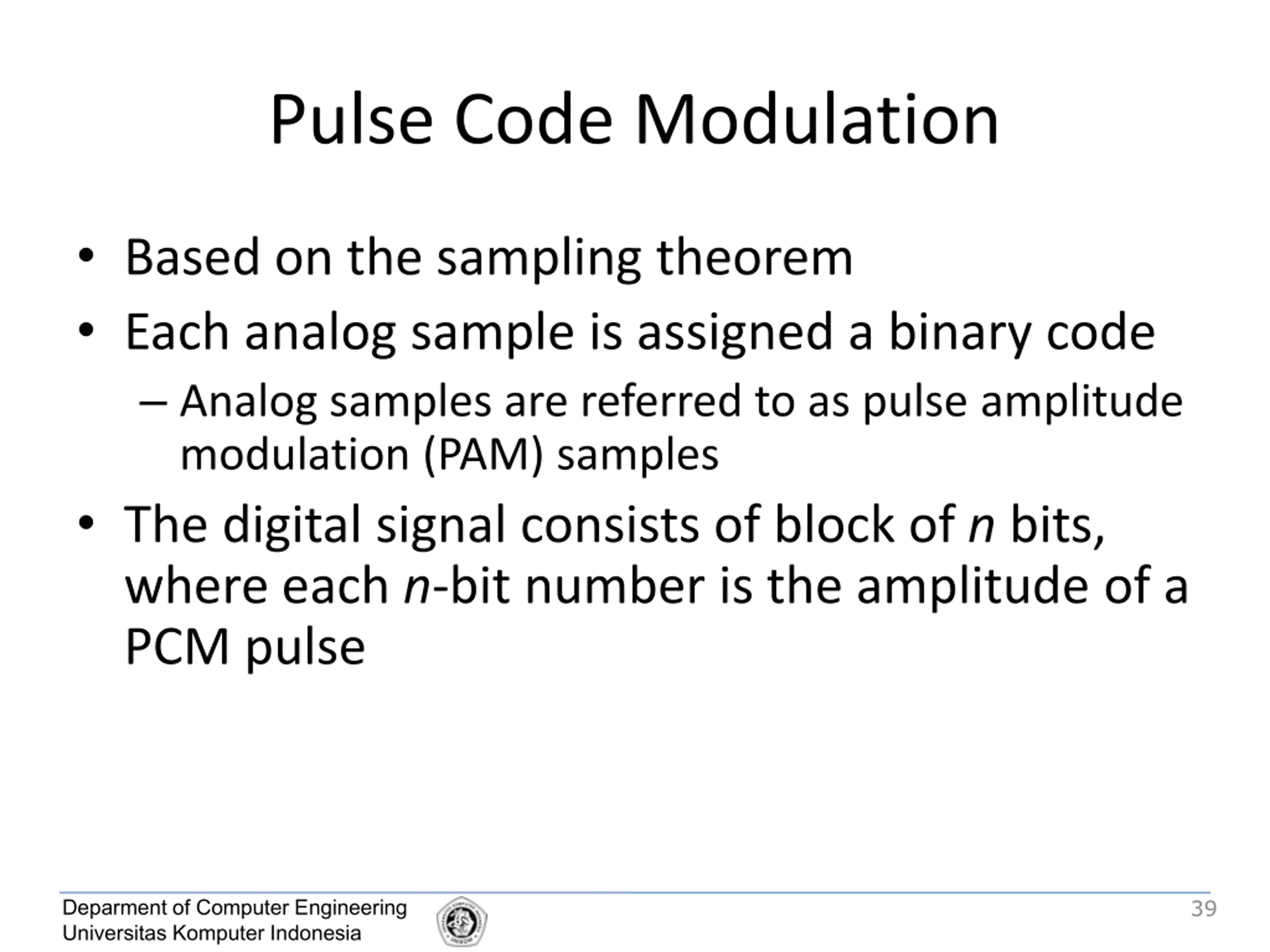 Pulse Code Modulation Based on the sampling theorem Each analog sample is assigned a binary code Analog samples are referred to as pulse amplitude modulation (PAM) samples The digital signal consists of block of n bits, where each n-bit number is the amplitude of a PCM pulse Deparment of Computer Engineering Universitas Komputer Indonesia 39