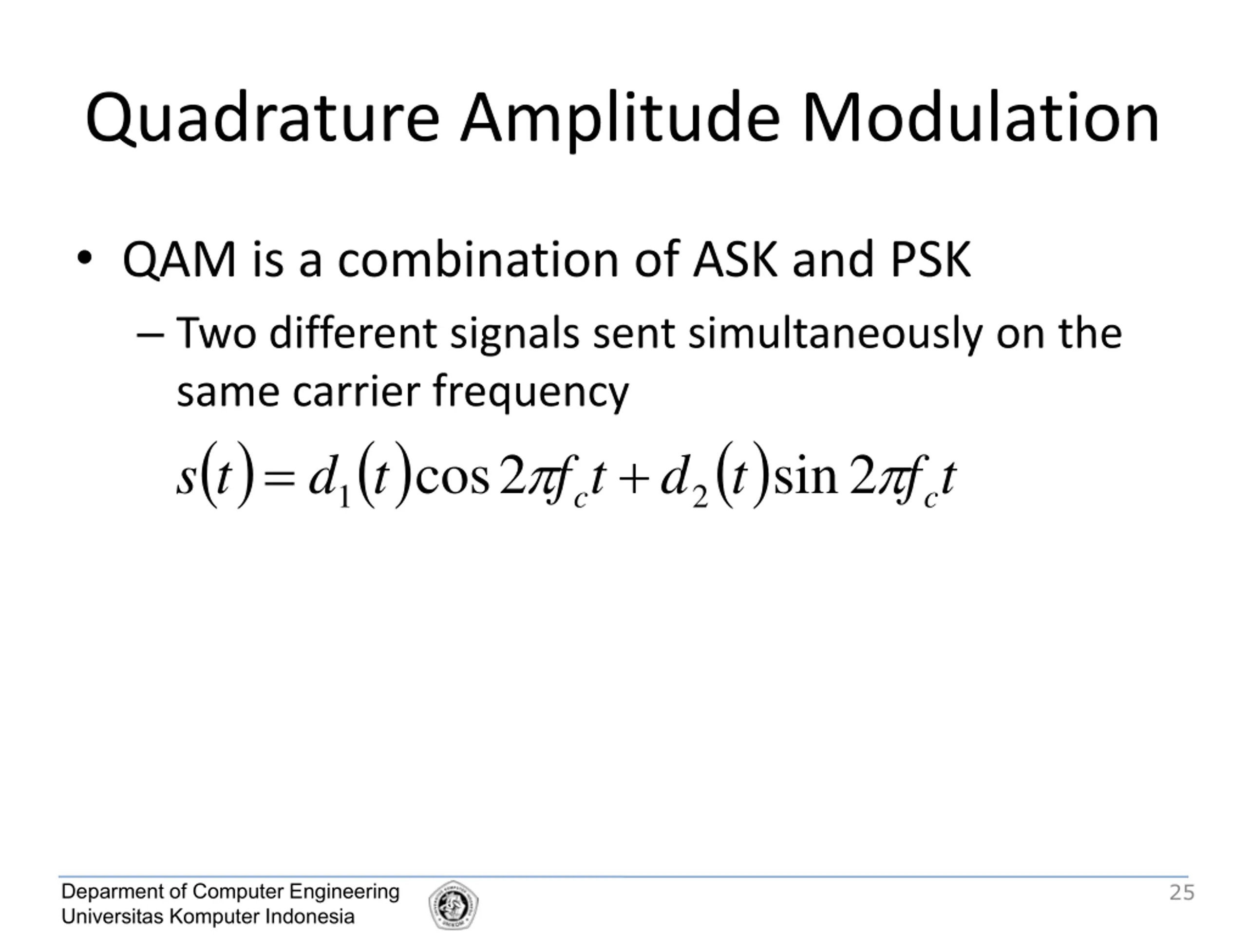 Quadrature Amplitude Modulation QAM is a combination of ASK and PSK Two different signals sent simultaneously on the same carrier frequency ( ) ( ) t f t d t s c 2 cos 1 = ( ) t + t f c 2 sin d 2 Deparment of Computer Engineering Universitas Komputer Indonesia 25
