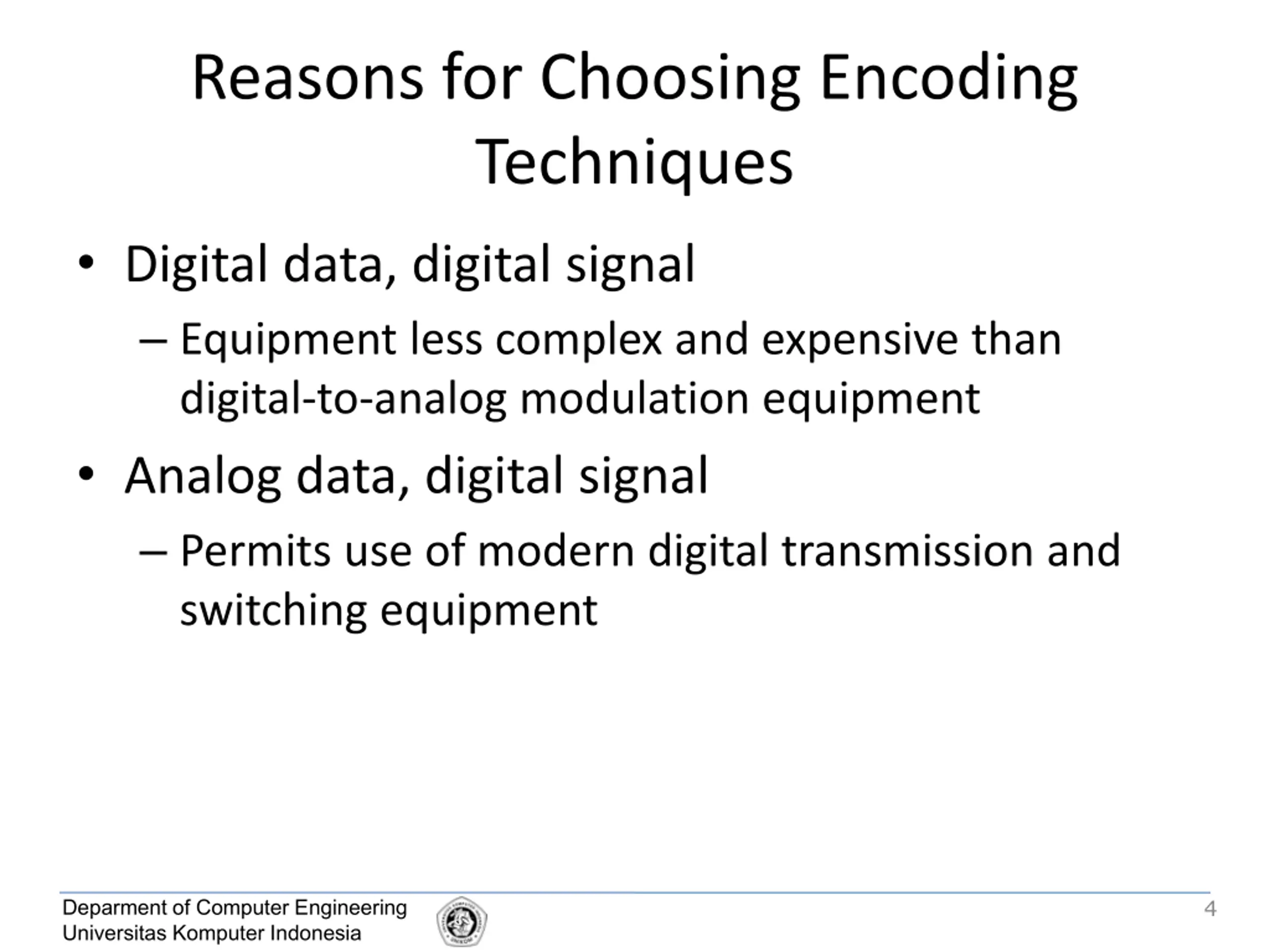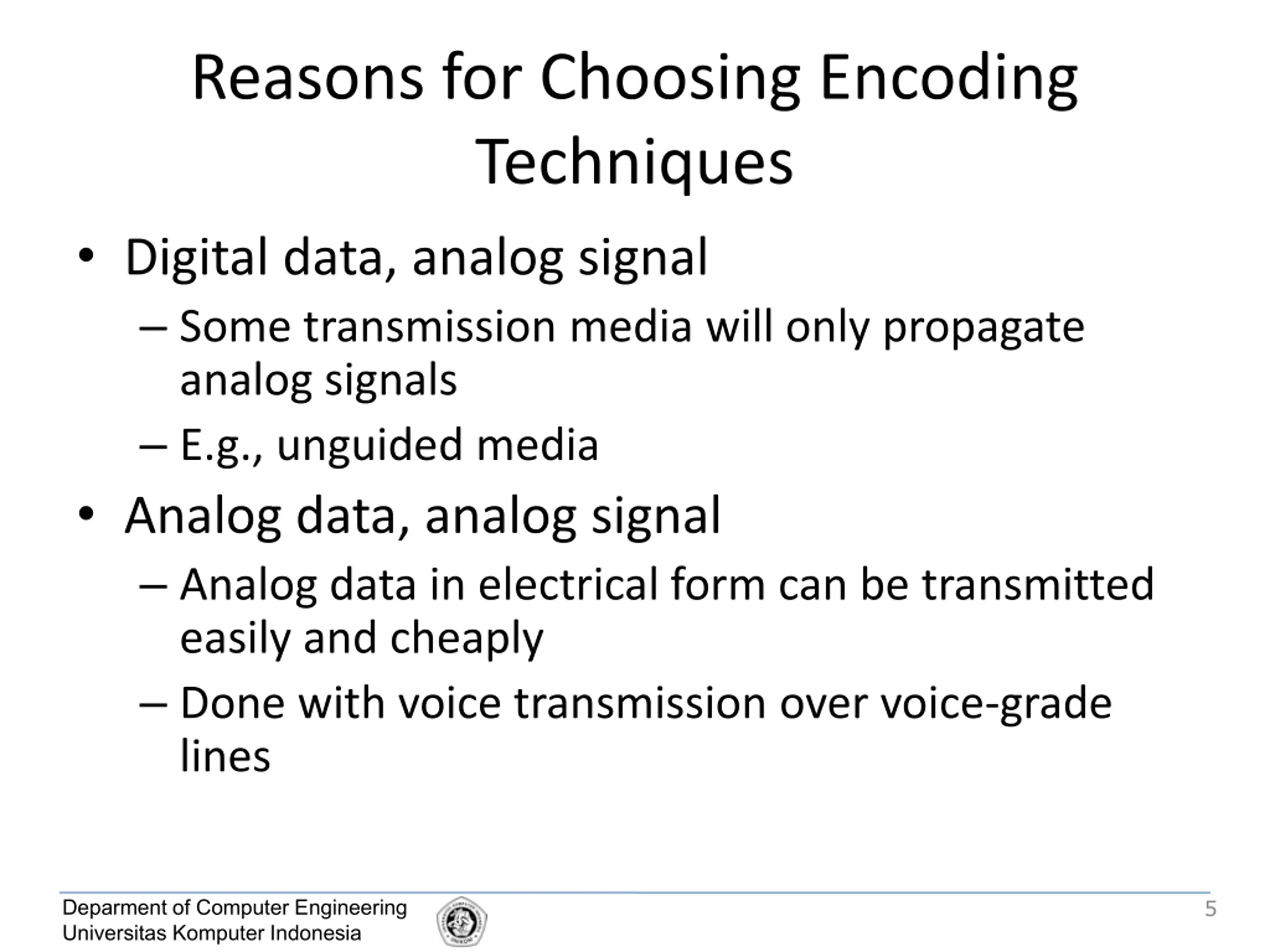 Reasons for Choosing Encoding Techniques Digital data, digital signal Equipment less complex and expensive than digital-to-analog modulation equipment Analog data, digital signal Permits use of modern digital transmission and switching equipment Deparment of Computer Engineering Universitas Komputer Indonesia 4