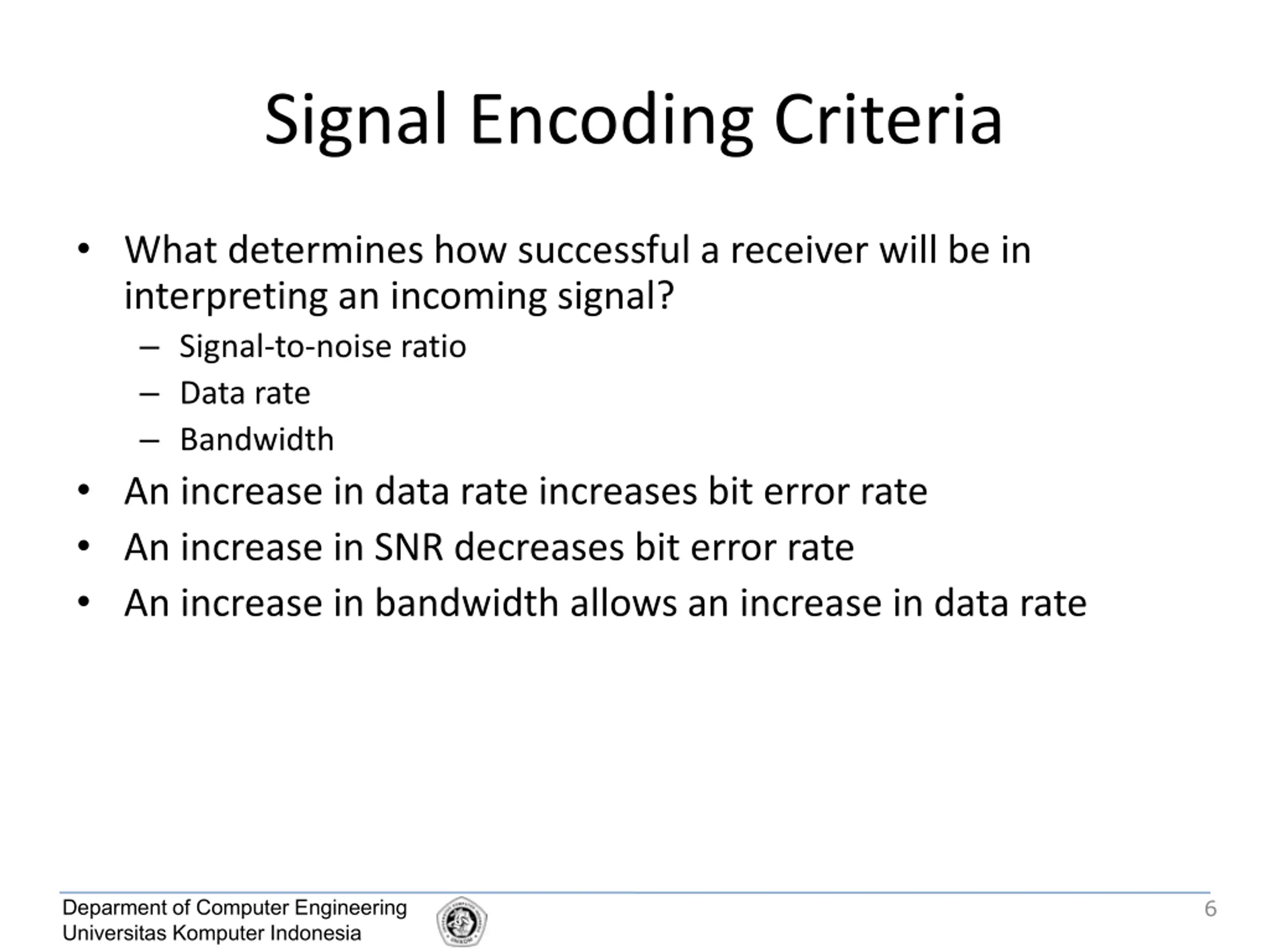 Reasons for Choosing Encoding Techniques Digital data, analog signal Some transmission media will only propagate analog signals E.g., unguided media Analog data, analog signal Analog data in electrical form can be transmitted easily and cheaply Done with voice transmission over voice-grade lines Deparment of Computer Engineering Universitas Komputer Indonesia 5