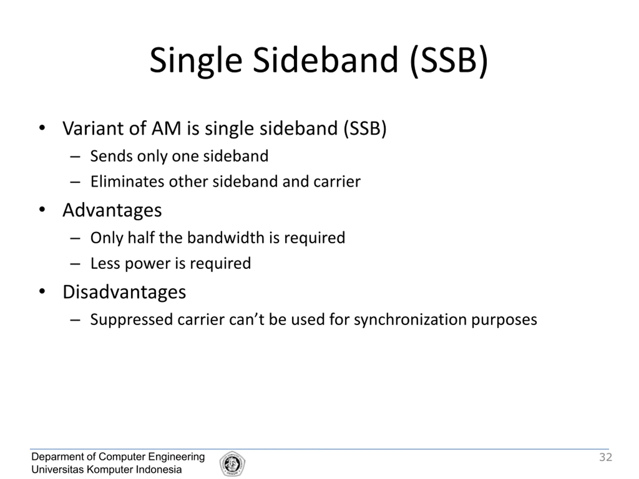 Single Sideband (SSB) Variant of AM is single sideband (SSB) Sends only one sideband Eliminates other sideband and carrier Advantages Only half the bandwidth is required Less power is required Disadvantages Suppressed carrier can t be used for synchronization purposes Deparment of Computer Engineering Universitas Komputer Indonesia 32