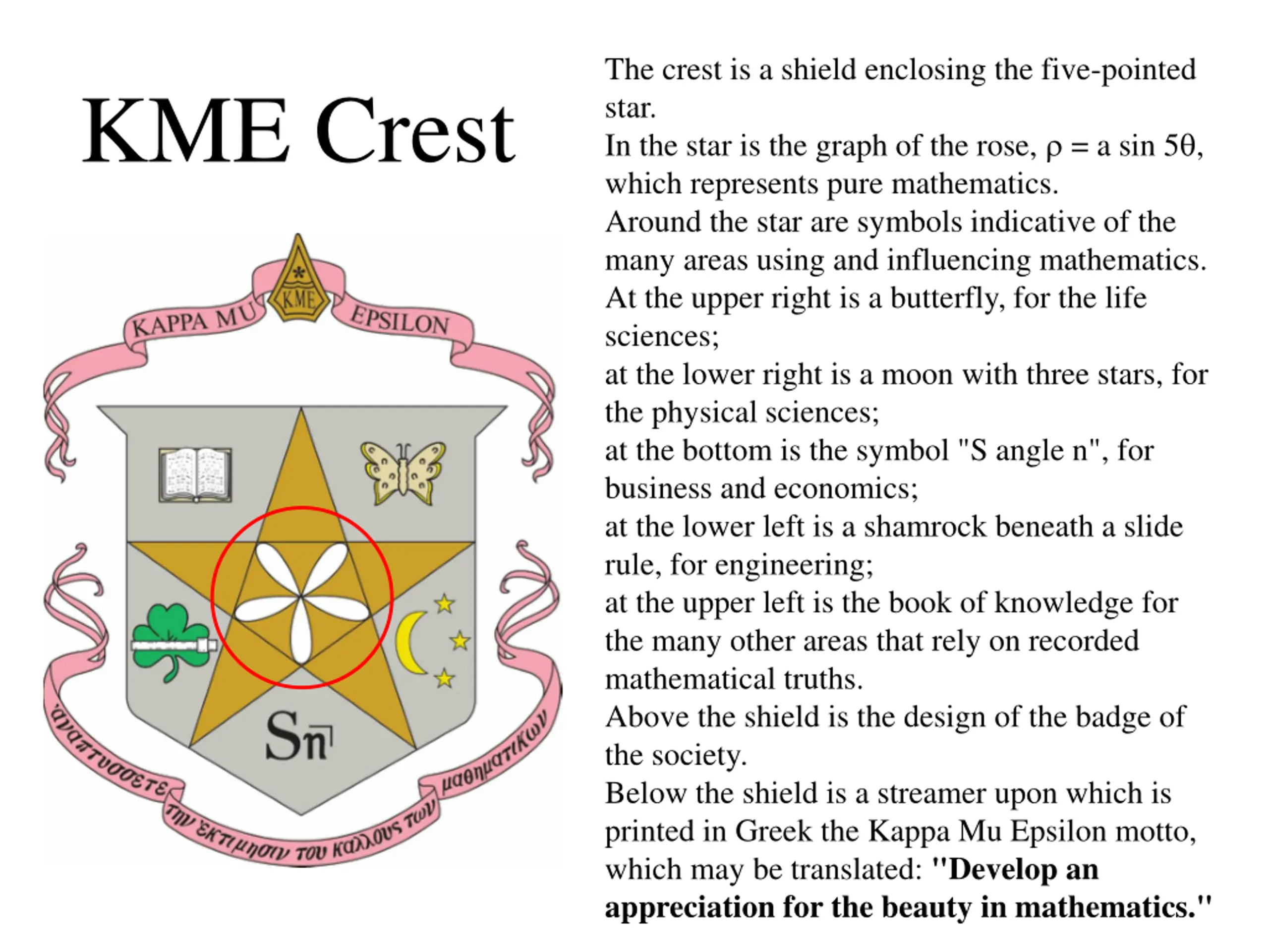 The crest is a shield enclosing the five-pointed star. In the star is the graph of the rose, = a sin 5 , which represents pure mathematics. Around the star are symbols indicative of the many areas using and influencing mathematics. At the upper right is a butterfly, for the life sciences; at the lower right is a moon with three stars, for the physical sciences; at the bottom is the symbol "S angle n", for business and economics; at the lower left is a shamrock beneath a slide rule, for engineering; at the upper left is the book of knowledge for the many other areas that rely on recorded mathematical truths. Above the shield is the design of the badge of the society. Below the shield is a streamer upon which is printed in Greek the Kappa Mu Epsilon motto, which may be translated: "Develop an appreciation for the beauty in mathematics." KME Crest