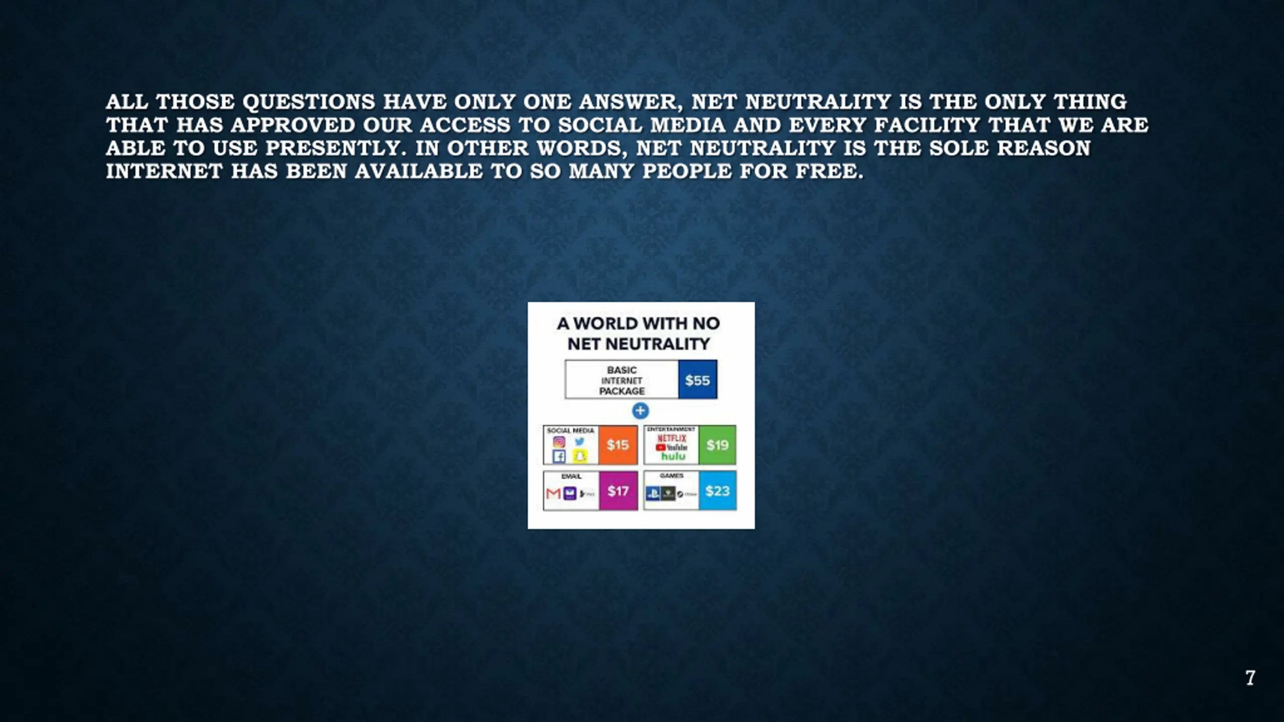 ALL THOSE QUESTIONS HAVE ONLY ONE ANSWER, NET NEUTRALITY IS THE ONLY THING THAT HAS APPROVED OUR ACCESS TO SOCIAL MEDIA AND EVERY FACILITY THAT WE ARE ABLE TO USE PRESENTLY. IN OTHER WORDS, NET NEUTRALITY IS THE SOLE REASON INTERNET HAS BEEN AVAILABLE TO SO MANY PEOPLE FOR FREE. 7