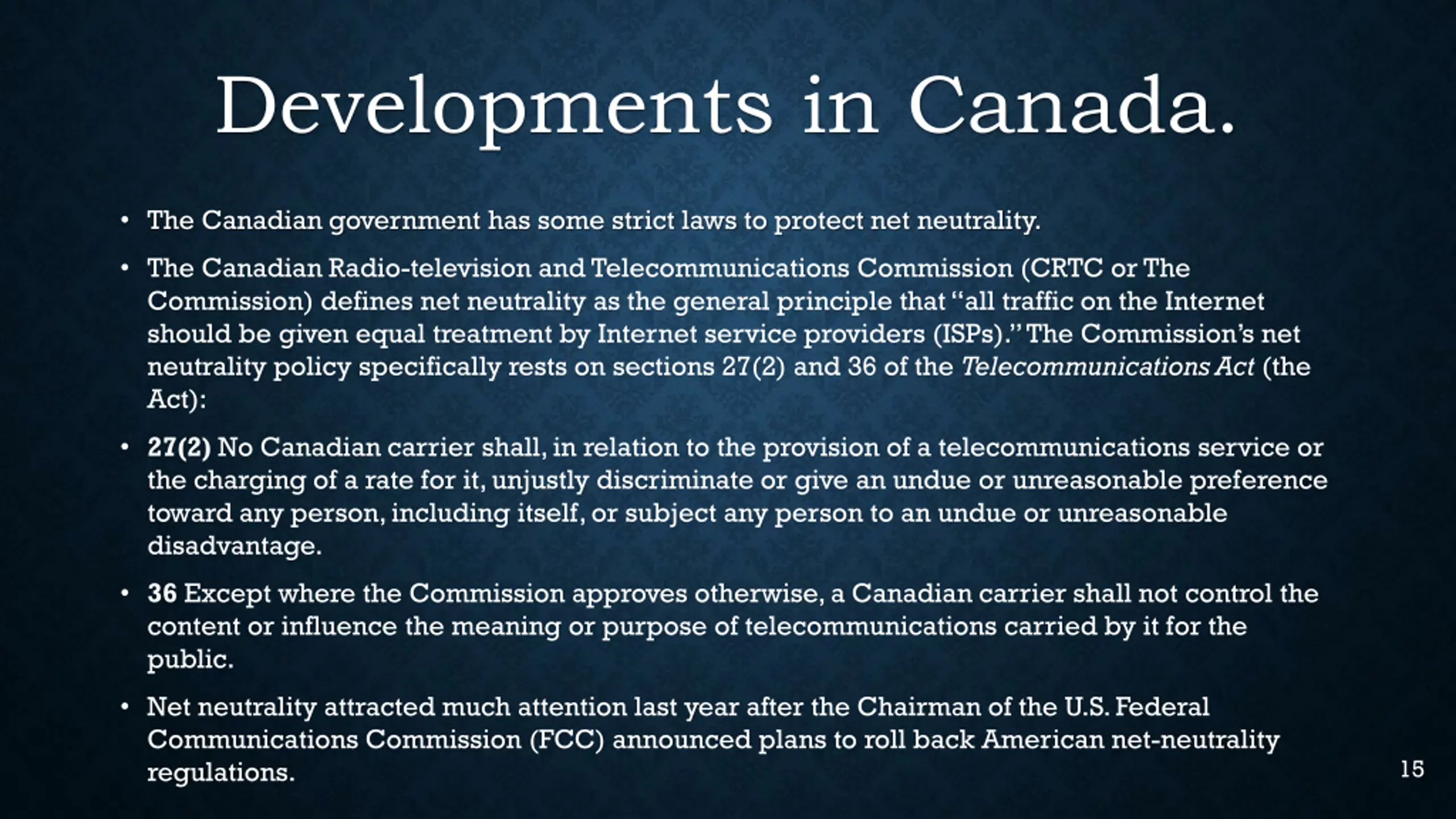 Developments in Canada. The Canadian government has some strict laws to protect net neutrality. The Canadian Radio-television and Telecommunications Commission (CRTC or The Commission) defines net neutrality as the general principle that all traffic on the Internet should be given equal treatment by Internet service providers (ISPs). The Commission s net neutrality policy specifically rests on sections 27(2) and 36 of the Telecommunications Act (the Act): 27(2) No Canadian carrier shall, in relation to the provision of a telecommunications service or the charging of a rate for it, unjustly discriminate or give an undue or unreasonable preference toward any person, including itself, or subject any person to an undue or unreasonable disadvantage. 36 Except where the Commission approves otherwise, a Canadian carrier shall not control the content or influence the meaning or purpose of telecommunications carried by it for the public. Net neutrality attracted much attention last year after the Chairman of the U.S. Federal Communications Commission (FCC) announced plans to roll back American net-neutrality regulations. 15